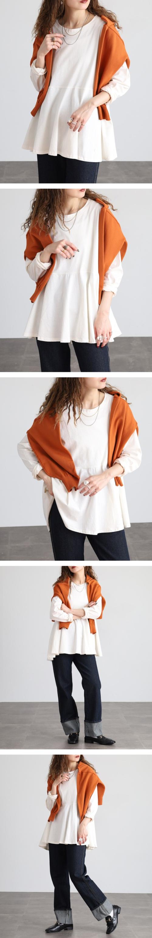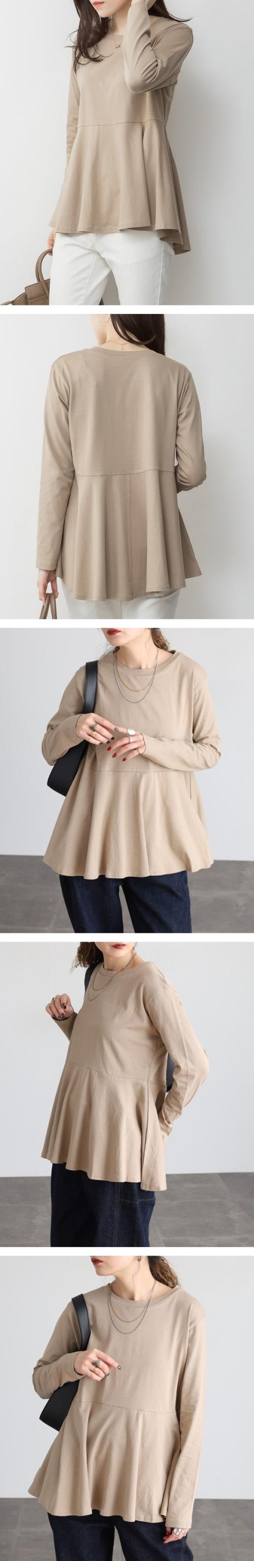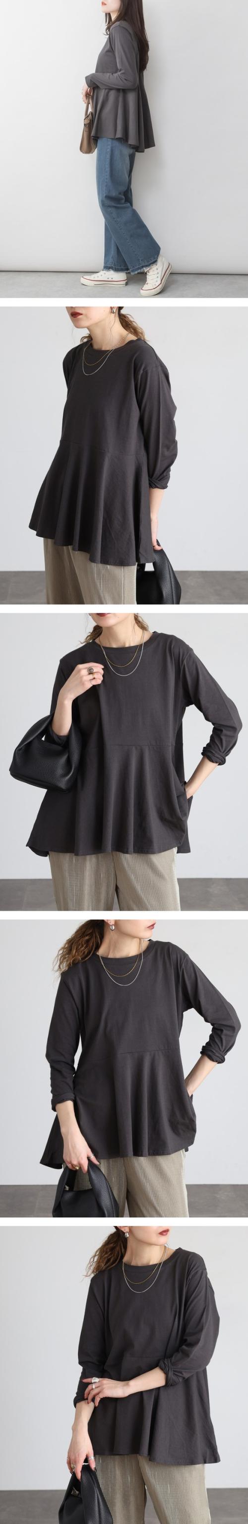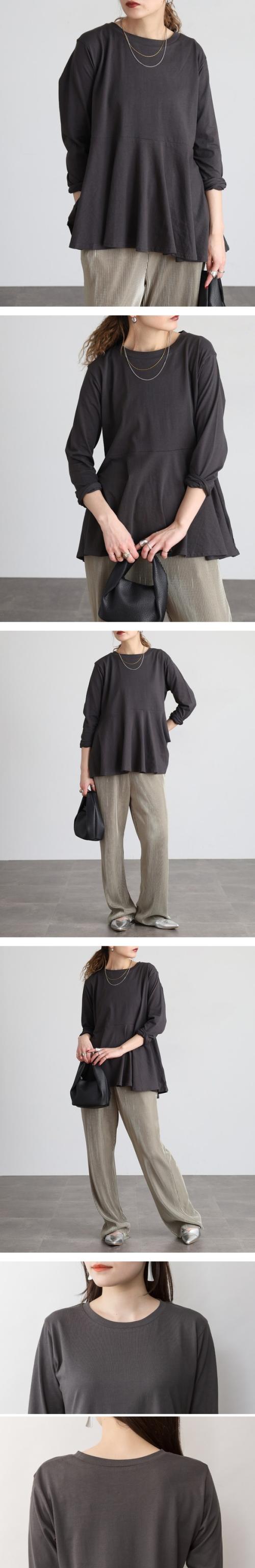 | 裾に向かってふんわり広がるフレアシルエットが印象的なカットソー。アンダーバストからの切り替えラインが女性らしさを引き立て、コーディネートにやさしいニュアンスを添えてくれます。 さらっとした薄手のコットン生地で、軽やかな着心地が魅力。季節の変わり目から長いシーズン活躍し、1枚ではもちろん、羽織りを重ねてもすっきりまとまります。 ゆったりとしたシルエットで着やすさがありつつ、袖はややすっきりとした仕立て。 切り替えラインはスタイルを引き立てるデザインですが、バストにボリュームのある方はお腹まわりが強調される場合も。その分、裾の広がりが腰まわりをさりげなくカバーしてくれるので、体型に合わせてバランスよく楽しめます。 シーン提案 デニムに合わせて、休日のリラックススタイルに。 細身のパンツと合わせれば、オフィスカジュアルにも。 カーディガンやジャケットを羽織って、きれいめコーデにアレンジ。 |