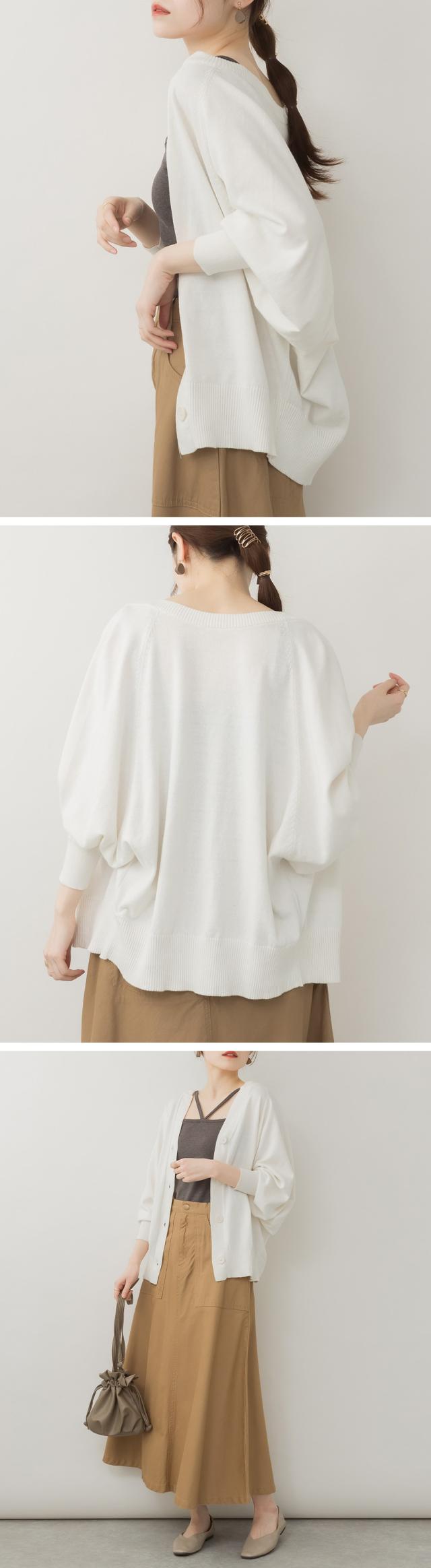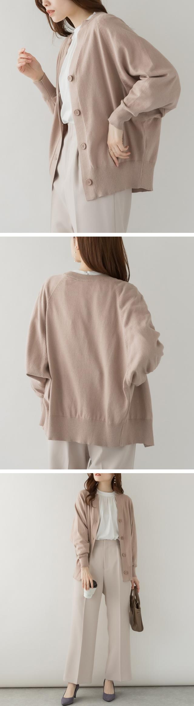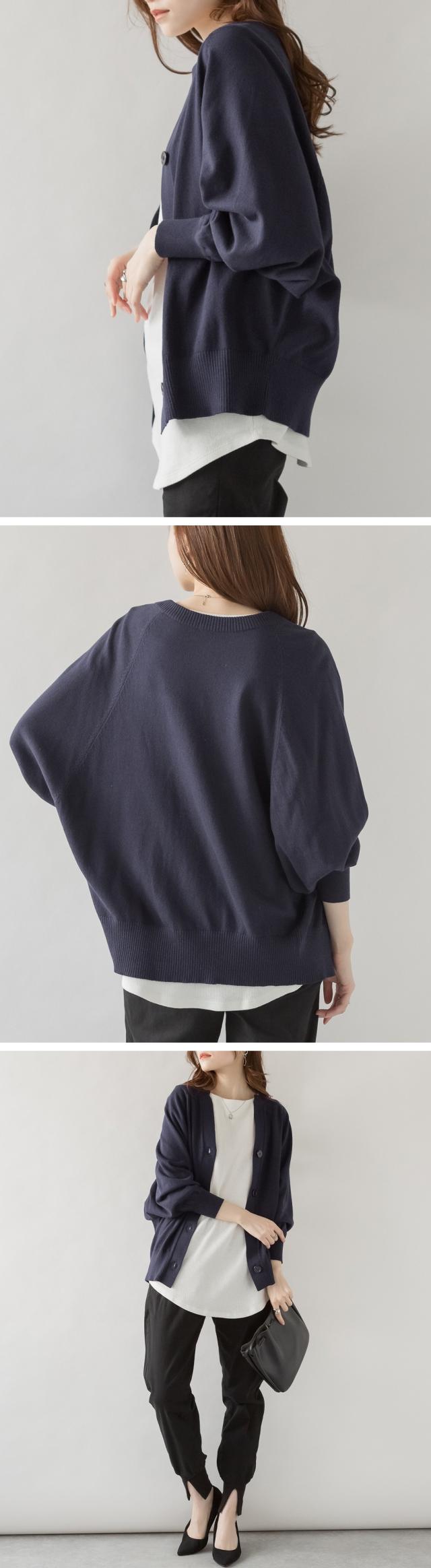 | ゆったりとしたドルマンスリーブが抜け感を演出するカーディガン。程よく開いたキーネックが顔まわりをすっきり見せ、シンプルながら大人っぽい印象に。綿100%のやわらかな生地は肌なじみがよく、春秋の羽織りや冷房対策にも活躍します。前を閉じてプルオーバー風に、開けてラフに羽織ってと、着こなしの幅が広がる一枚。ボリューム袖のトップスにも重ねやすい、余裕のある身幅も魅力です。 |