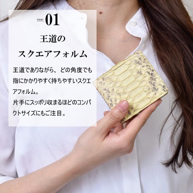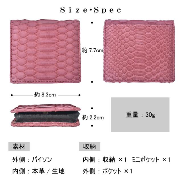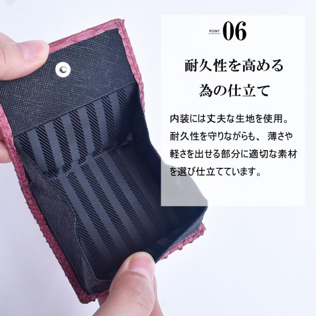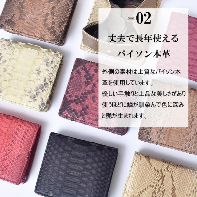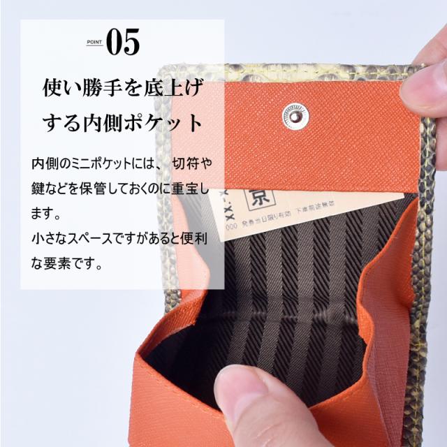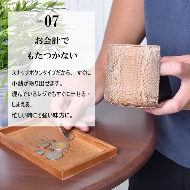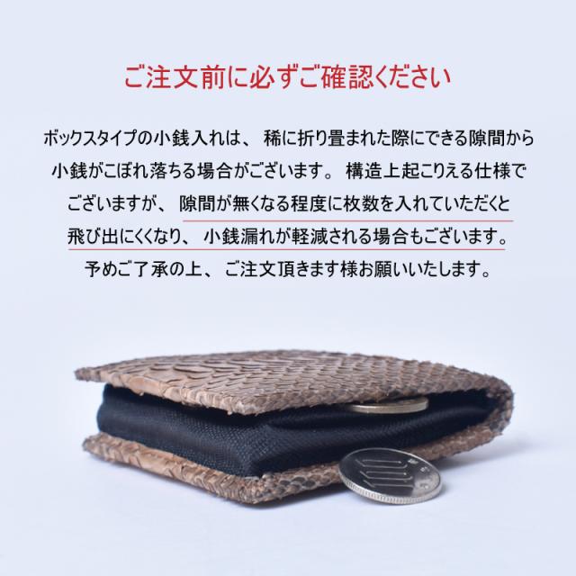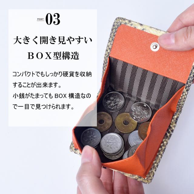 | 特徴 | 使いやすいを考えたパイソン本革ボックス型小銭入れが新登場♪ ■王道のスクエアフォルム 王道でありながら、どの角度でも指にかかりやすく持ちやすいスクエアフォルム。 片手にスッポリ収まるほどのコンパクトサイズにもご注目。 ■丈夫で長年使えるパイソン本革 外側の素材は上質なパイソン本革を使用しています。 優しい手触りと上品な美しさがあり使うほどに鱗が馴染んで色に深みと艶が生まれます。 ■大容量で探しやすいBOX型構造 コンパクトでもしっかり硬貨を収納することが出来ます。 小銭がたまってもBOX構造なので一目で見つけられます。 ■意外と便利な背面収納ポケット お札やカードなどが収納でき、意外に使えると好評なポケット。 エチケットガムや常備薬を入れておくも良し。 使い方はあなた次第です。 ■使い勝手を底上げする内側ポケット 内側のミニポケットには、切符や鍵などを保管しておくのに重宝します。 小さなスペースですがあると便利な要素です。 ■耐久性を高める為の仕立て 内装には丈夫な生地を使用。 耐久性を守りながらも、薄さや軽さを出せる部分に適切な素材を選び仕立てています。 ■お会計でもたつかない スナップボタンタイプだから、すぐに小銭が取り出せます。 混んでいるレジでもすぐに出せる・しまえる。 忙しい時こそ強い味方に。 ■使いやすいデザイン シンプルなデザインなので性別・年齢問わずお使いいただけます。 カラーは上品な7色をご用意しました。 ■こだわったサイズ感 内ポケットやポシェットなどに収納し、使いたい時にパッと取り出せるコンパクトサイズ。 ※ご注文前に必ずご確認ください ボックスタイプの小銭入れは、稀に折り畳まれた際にできる隙間から小銭がこぼれ落ちる場合がございます。 構造上起こりえる仕様でございますが、隙間が無くなる程度に枚数を入れていただくと飛び出にくくなり、小銭漏れが軽減される場合もございます。 予めご了承の上、ご注文頂きます様お願いいたします。 |