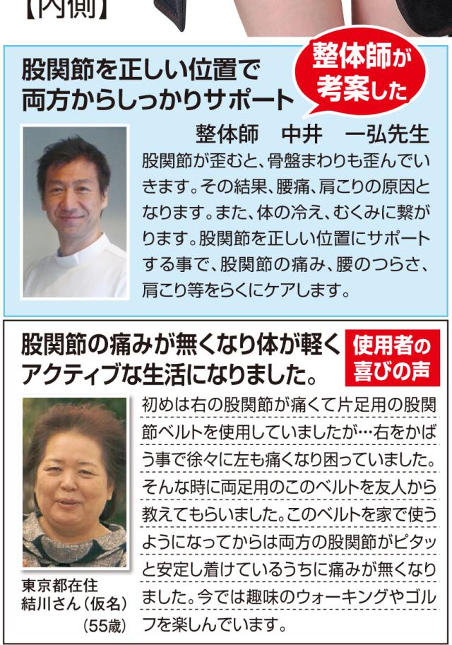 初めは右の股関節が痛くて片足用の股関節ベルトを使用していましたが…右をかばう事で徐々に左も痛くなり困っていました。そんな時に両足用のこのベルトを友人から教えてもらいました。このベルトを家で使うようになってからは両方の股関節がピタッと安定し着けているうちに痛みが無くなりました。今では趣味のウォーキングやゴルフを楽しんでいます。