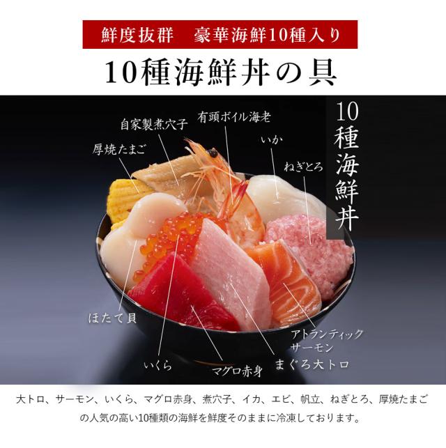 【10種の魚介が入った海鮮丼セット】大とろ、いくら、帆立、赤身、サーモン、穴子、有頭海老、いか、ねぎとろ、厚焼玉子の豪華10種の海鮮が入った海鮮丼セットです。1パック1食分になっているので、お好きなタイミングで好きな分だけお召し上がりいただけます。真空パックのまま流水解凍するだけの簡単な調理も人気に理由です。