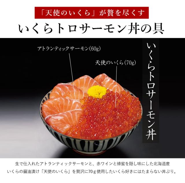 【いくらサーモン丼セット】生のまま仕入れたアトランティックサーモンが60gと、赤ワインや蜂蜜、特製醤油で漬けたせんざんオリジナルのいくら醤油漬け「天使のいくら」がたっぷり70g入った食べ応え抜群のセットです。