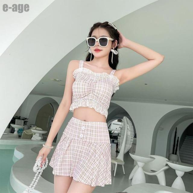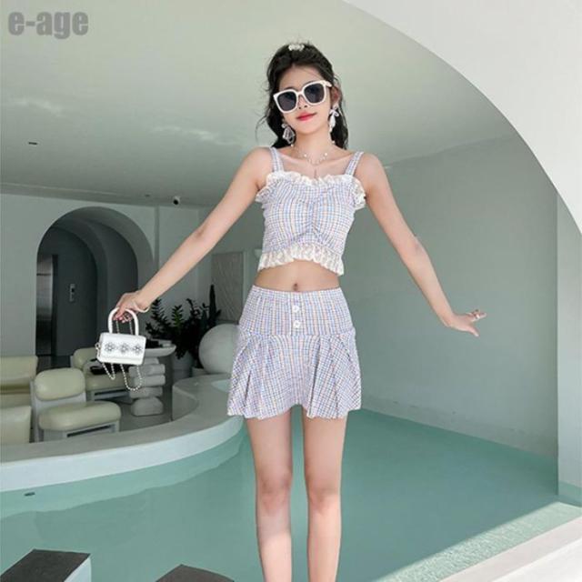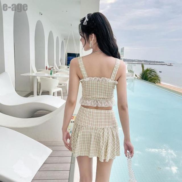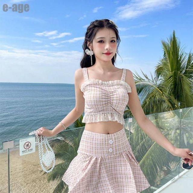水着 レディース 体型カバー チェック柄 タンキニ 袖なし ビキニ スカート 2点セット セパレート 水着 かわいい ビーチウェア 海 プール ビーチ 旅行