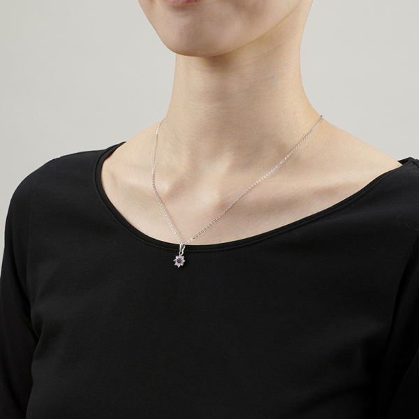 繊細に煌めく、可憐に可愛いプチペンダント、ジュエリータイプの磁気ネックレス!小振りでキュートながら 「アメジスト」にキュービックジルコニアの煌きが胸元を際立て、気品ある大人の女性を演出します。繊細ながら「小さな華」があるデザインは普段使いからオフィスまでシーンを選びません。さり気なく、150ミリテスラの磁石が 装着部位のコリと血行を良くします。【注意事項】※心臓ペースメーカー等の医療用電子機器を装着している方は使用できません。※「キュービックジルコニア」とは、人造宝石でありダイヤモンドではありません。