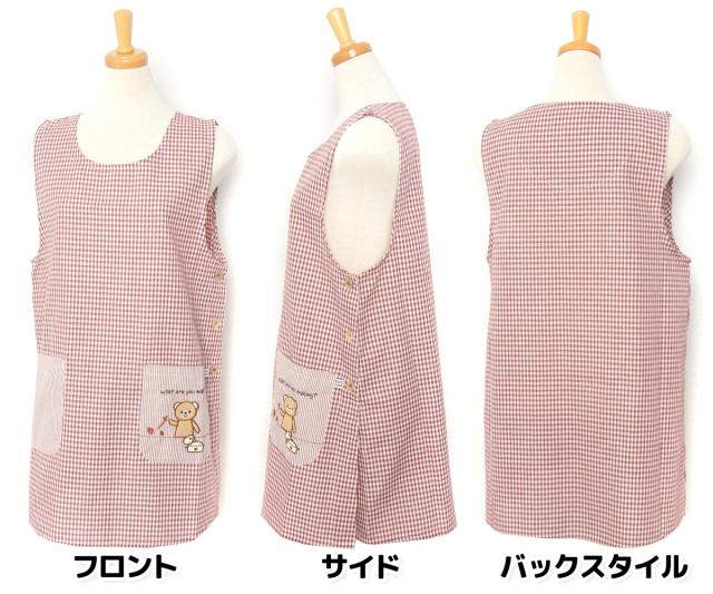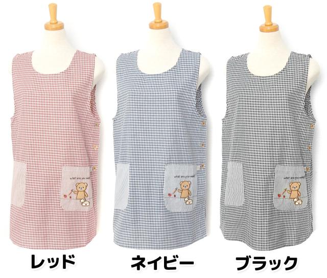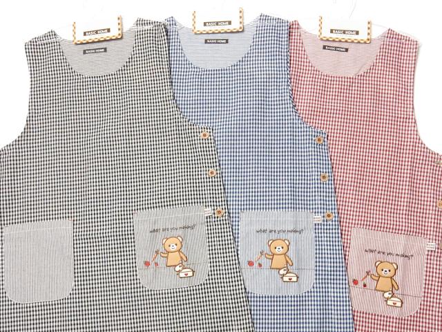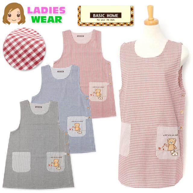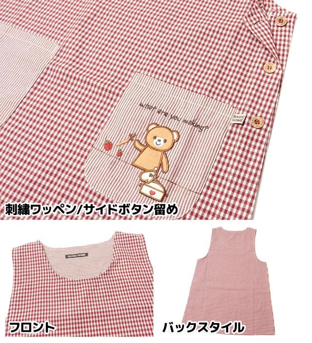 【送料無料】婦人 レディース ボックス型 エプロン サイドボタン留め ギンガムチェック柄 くま刺繍ワッペン ポケット付き sl-0484【メール便対応】