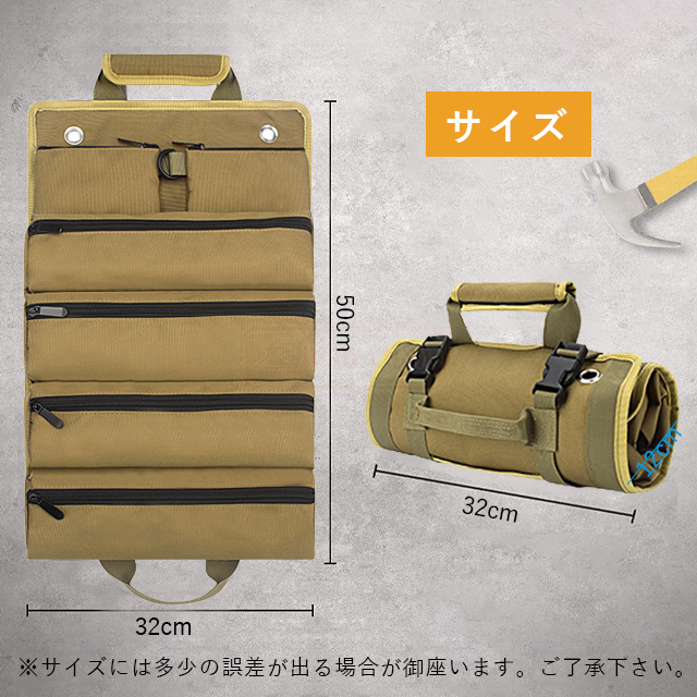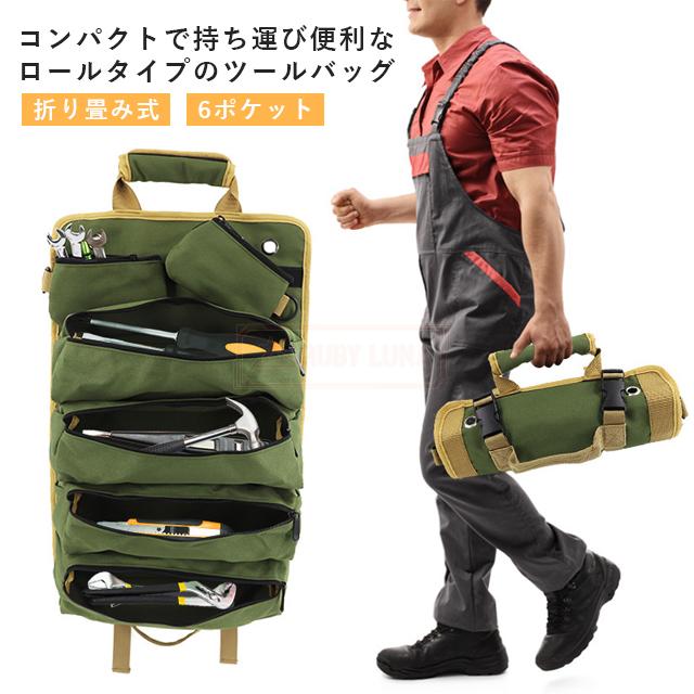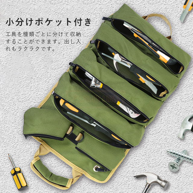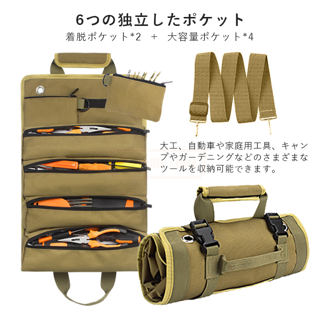 ツールバッグ ツールロールバッグ 工具いれ 工具ケース 工具袋 道具袋 高耐久 6つ収納ポケット カラビナ ストッパー付 多目的ツールケース 車載 家庭 大工収納 持ち運び便利 ツールバッグを巻いて収納でき、持ち運び便利、スペースを節約します 壁&車で掛けられ