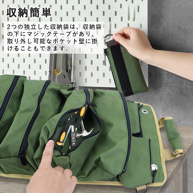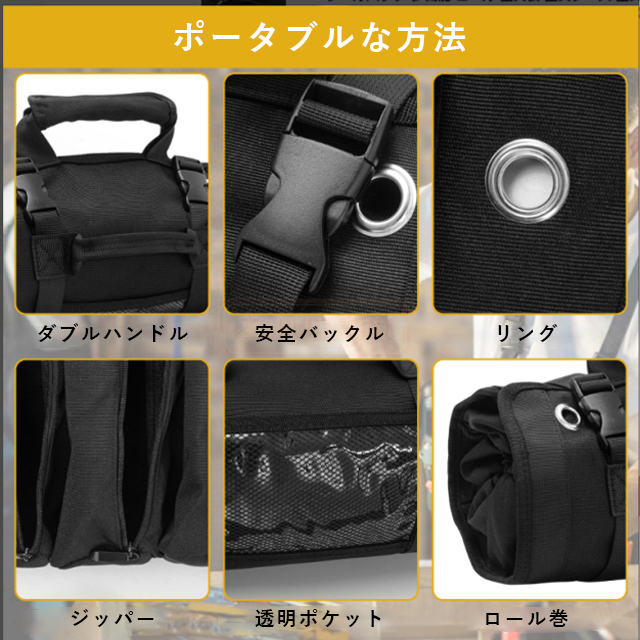 | 【持ち運びに便利】 | ◆トップハンドル付き、壁や車の椅子に下げることができ、物を取り出したり、置くことができます。 ◆丸めてチャックで止めてコンパクトにまとめられ、工具箱の仕分け管理にも使えますし、車載工具入れ用にもお勧めします。 |