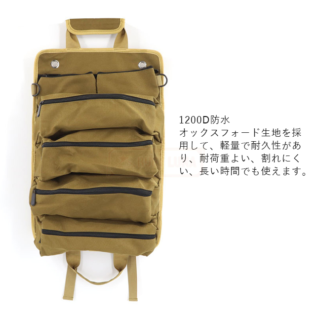 | 【耐久性】 | ◆その巻きツールケースはオックスフォード布の生地で作られています。 ◆軽くて、防水と超長時間の耐久性を持つ、長くご利用いただけます。 ◆耐摩耗性、効果的に鋭いものによる損傷を避けることができます。 |