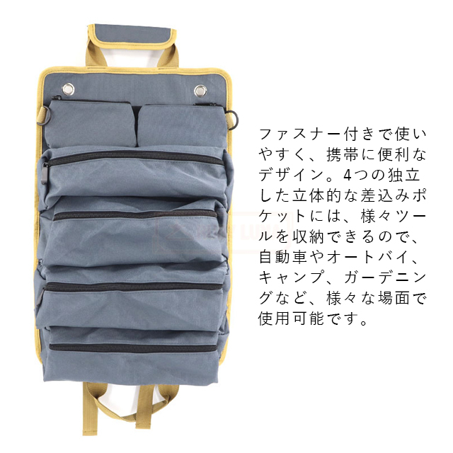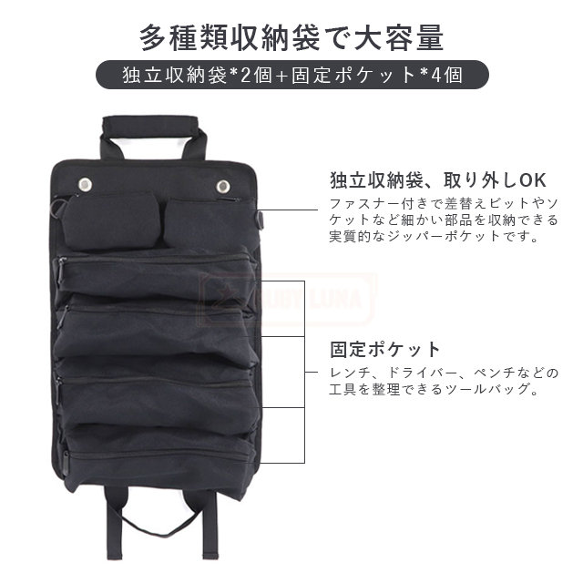 | 【多種類収納袋】 | ◆固定ポケット*4 個、独立収納袋*2 個。レンチ、ドライバー、ペンチなどの工具を整理できるツールバッグ;ファスナー付きで差替えビットやソケットなど細かい部品を収納できる実質的なジッパーポケットです。 |
