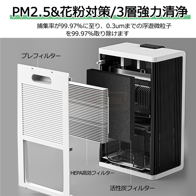 | 【集じん/イオン/UV除菌 空気清浄機】 | ◆超細密不織布集塵フィルターにより、空気中の花粉、ほこり、アレル物質などを強力吸着、マイナスイオンを放出することで、臭いの元やカビなどを分解し、浮遊菌を減少して、部屋干しの生乾き臭を抑え、新鮮な空気を提供するなどの空気清浄効果があり。 |