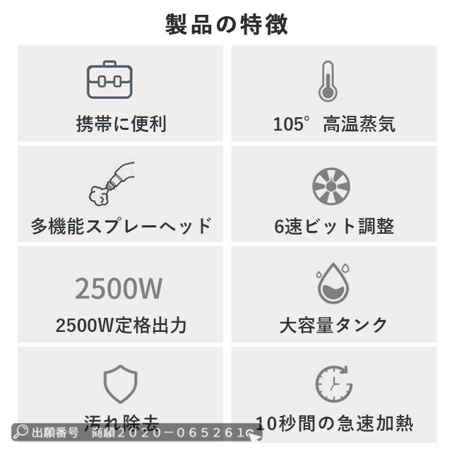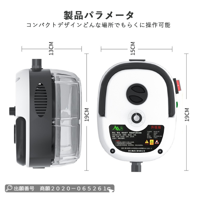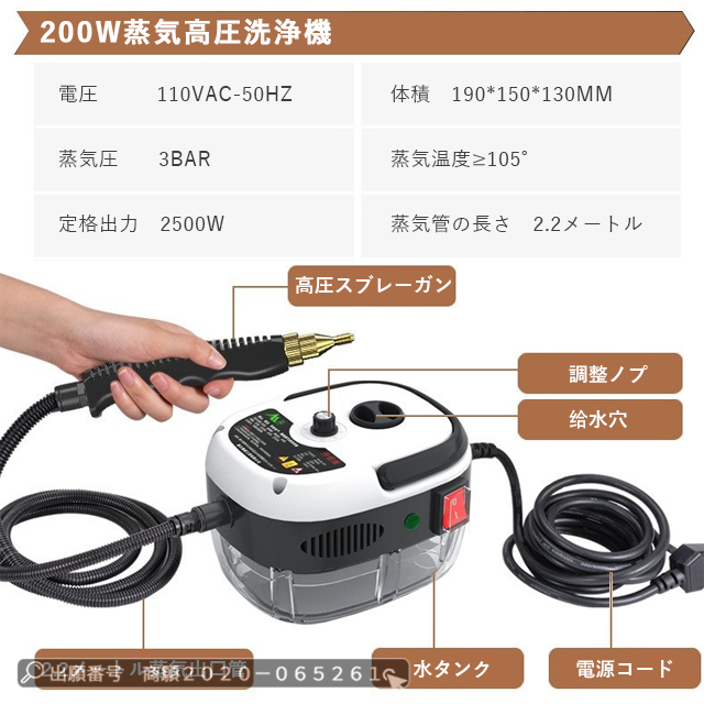 | 商品仕様 | ◆電圧:110VAC-50HZ ◆蒸気圧:3BAR ◆定格出力:2500W ◆体積:190*150*130MM ◆蒸気温度:105° ◆蒸気管の長さ:2.2メートル |