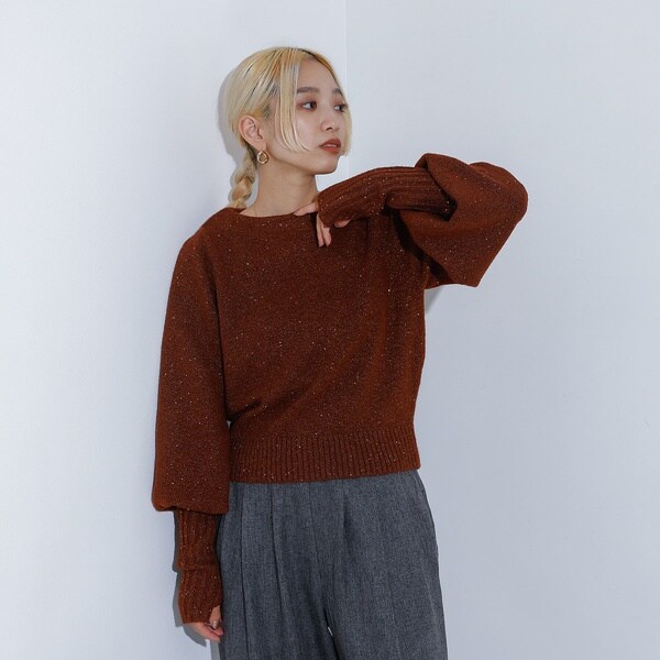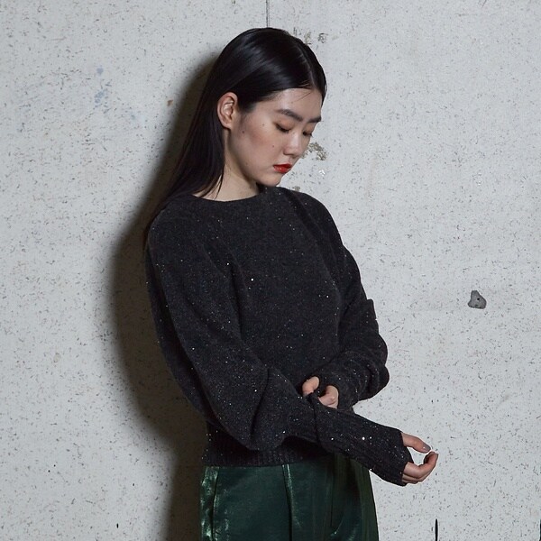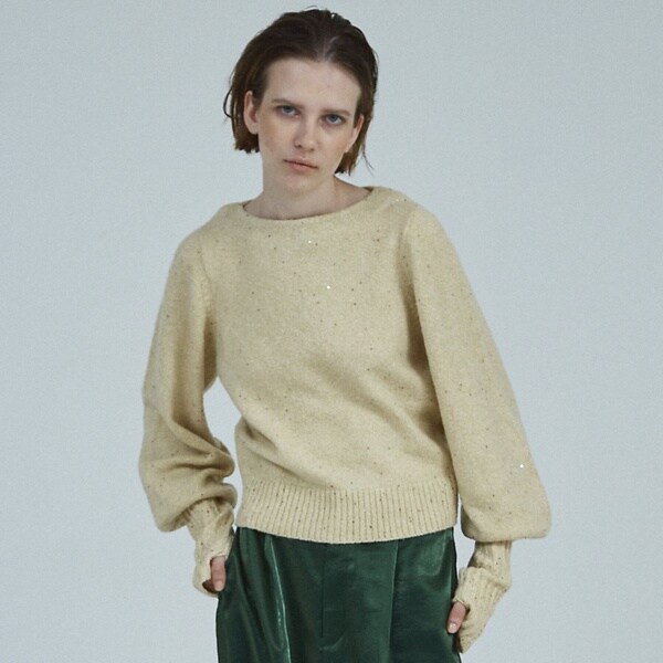 小さなスパンコールが光に当たるとキラキラと光る印象的なニット。