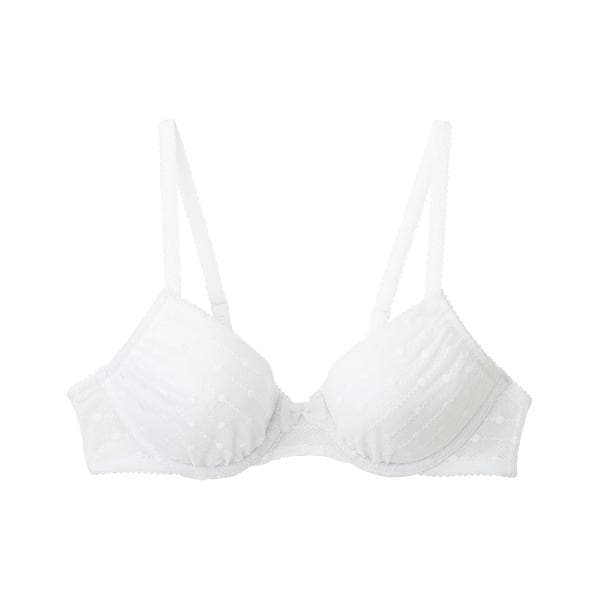 【ジュニア用ブラジャー STEP3】U字樹脂ワイヤー ・3/4カップ ・後ろホック ・ストラップタイプ(調節あり)★中学生や高校生におすすめのジュニアブラ【バスト全体がおおきくなってきたらつけるブラ】●やわらかなジュニア専用ワイヤーできちんとささえる バストへの圧迫が少ないやわらかな樹脂を使ったU字樹脂ワイヤーは、成長に大切な部分にあたりにくい形 成長に合わせたゆるやかな深めのカーブで、まるくふくらむバストの輪郭に沿ってきちんとささえ、バストを守ってくれる●カップ裏打ちの肌側は、肌ざわりのよいやさしい素材を使用●土台のないアンダーフリー設計でラクなつけごこち コンパクトな見た目で、しめつけ感も少ない《シンプルで少し大人びたカラーやデザインが特徴のグループ》●かわいさと大人のテイストをあわせ持つ 透け感のある水玉ボーダーのレースがかわいい、ちょっぴり背伸びをしたデザイン●シンプルで大人っぽい3色展開 WHカラーは、パールのように上品な定番カラーで、スクールにもおすすめ BLカラーは、見えても気になりにくい第2の定番カラー レースに透け感をもたせて、他のカラーとは違った少し大人のテイストに PUカラーは、やさしいピンクパープルをベースにアクセントカラーを付けて、クールでかわいい印象に・前中心にチュールリボン付き●詳細情報ワイヤーありホック後ろ留めホック2段2調節パッド受けなし※お洗濯は、必ず「取扱い表示」にしたがってください。