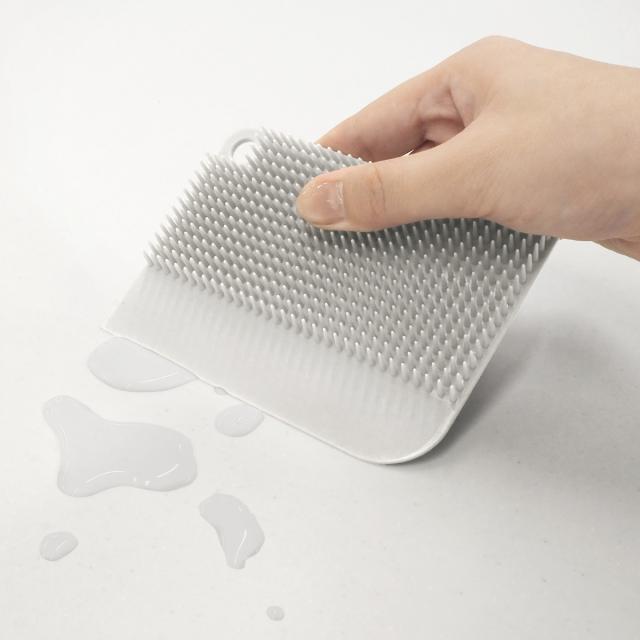 食洗機前の予洗いや作業場所に落ちた水滴をさっと落とす時に便利なブラシ付きスクイージーです。樹脂製なのでスポンジと比べて汚れが染み込みにくく、衛生的で長くお使いいただけます。