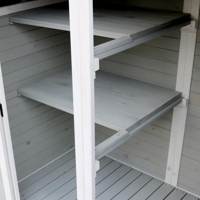 高さのあるホウキやデッキブラシ、園芸用の支柱などが手前に収納出来る設計です。収納物に合わせて棚は取り外すことも可能です。また、中央に仕切り板がないため、横幅を広く使用できます。