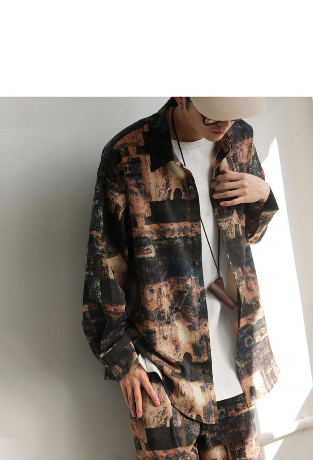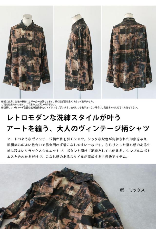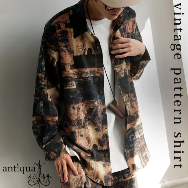 【検索ワード】ヴィンテージ柄シャツ シャツ メンズ トップス 長袖 ニュアンス柄 アート柄 柄シャツ 柄 レギュラーカラー 襟付き 配色 前開き 光沢感 とろみ 落ち感 ゆったり 華やか モダン モード 高級感 体型カバー ブラウス デザインシャツ ユニセックス 男性 男 かっこいい カッコイイ カジュアル antiqua treecafe アンティカ ツリーカフェ メンズファッション トレンド コーディネート 通販 ブランド 春 夏 秋 冬 オールシーズン あんてぃか かっこいい あんてぃか
