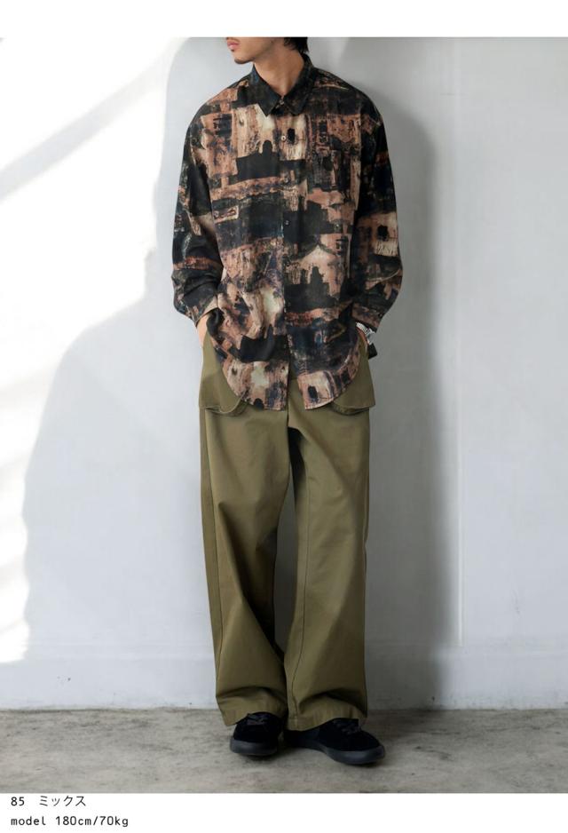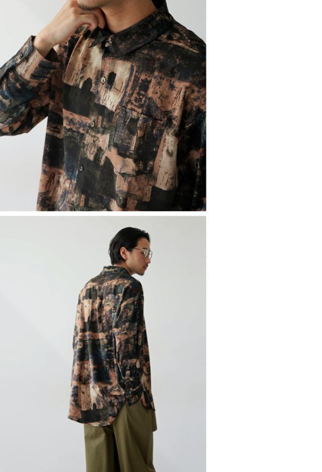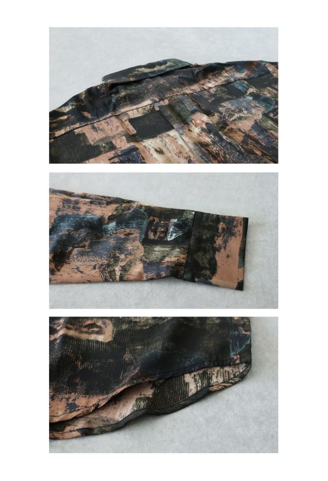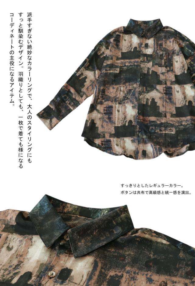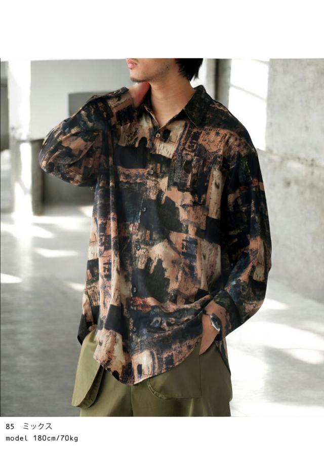 zy-00112z 長袖 ニュアンス柄 アート柄 柄シャツ 柄 レギュラーカラー 襟付き 配色 前開き 光沢感 とろみ 落ち感 ゆったり 華やか モダン モード 高級感 体型カバー デザインシャツ