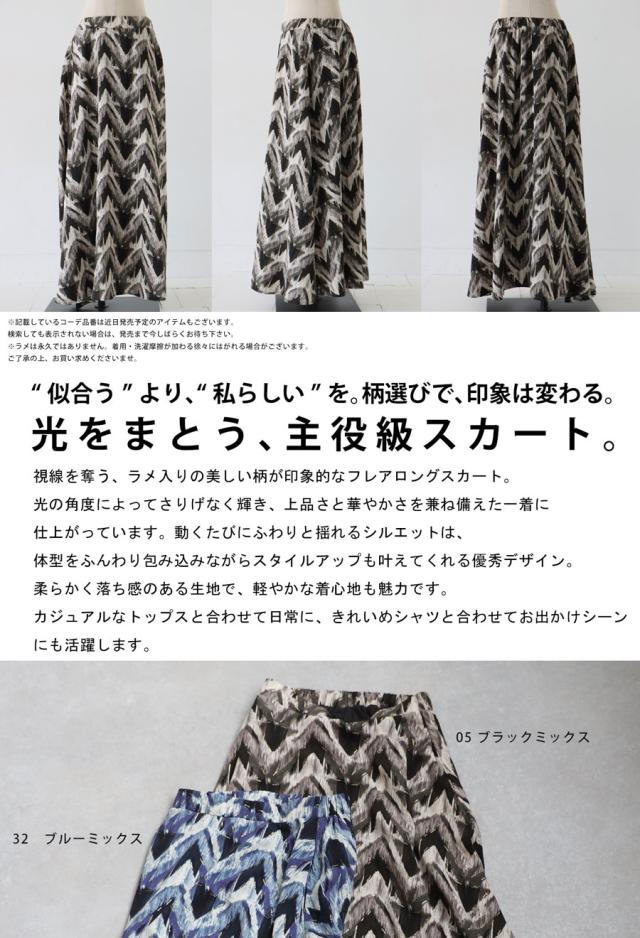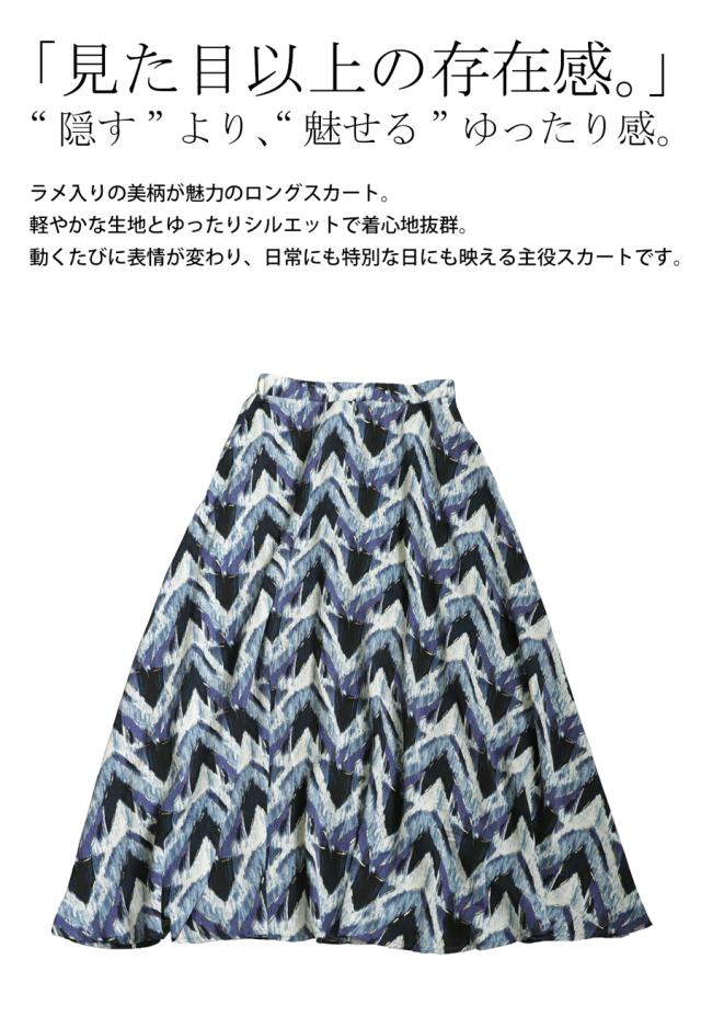 py-00781 ロング 柄スカート 柄 ニュアンス 水彩 フレア ラメ ボリューム Aライン ロングスカート マキシ丈 華やか ウエストゴム 裏地付き 落ち感 ゆったり 大きいサイズ