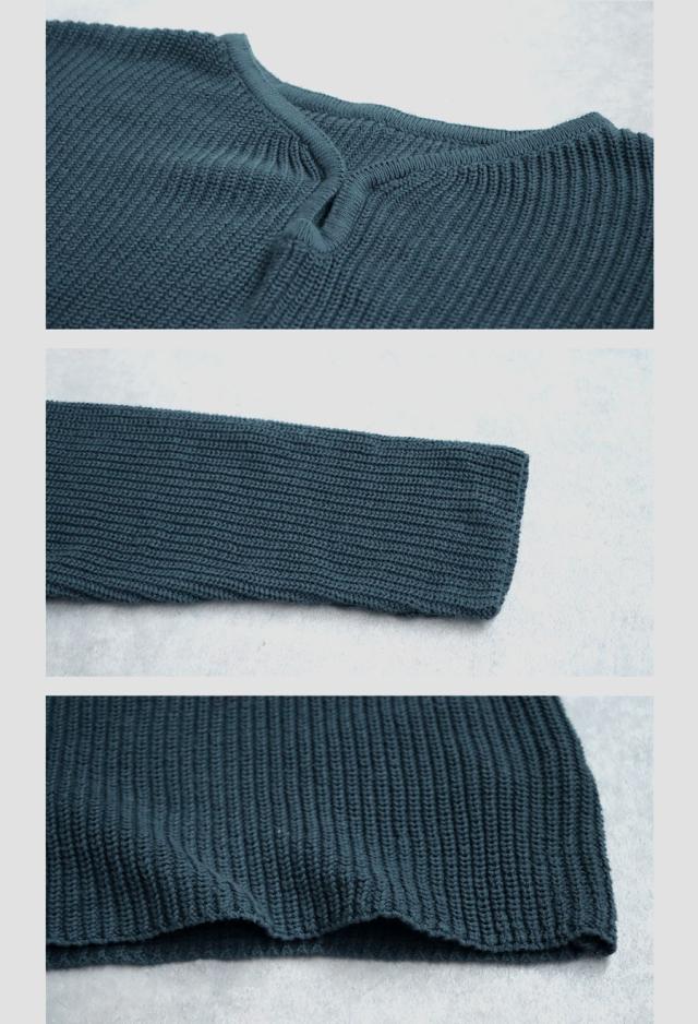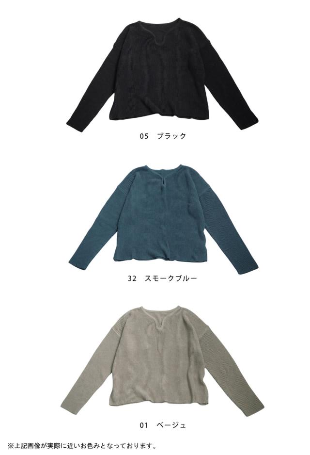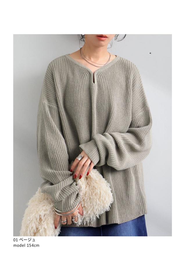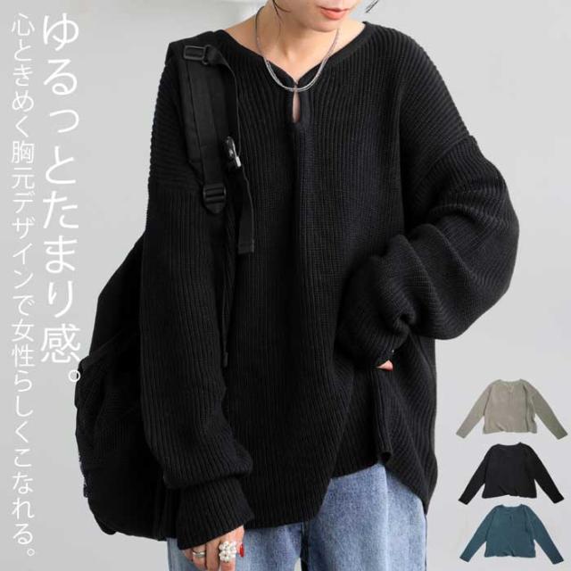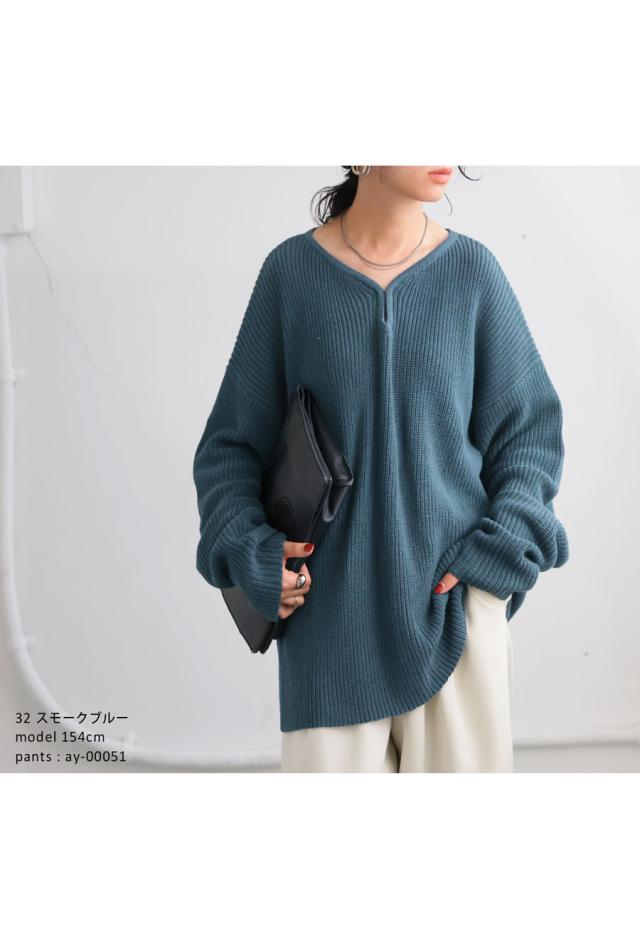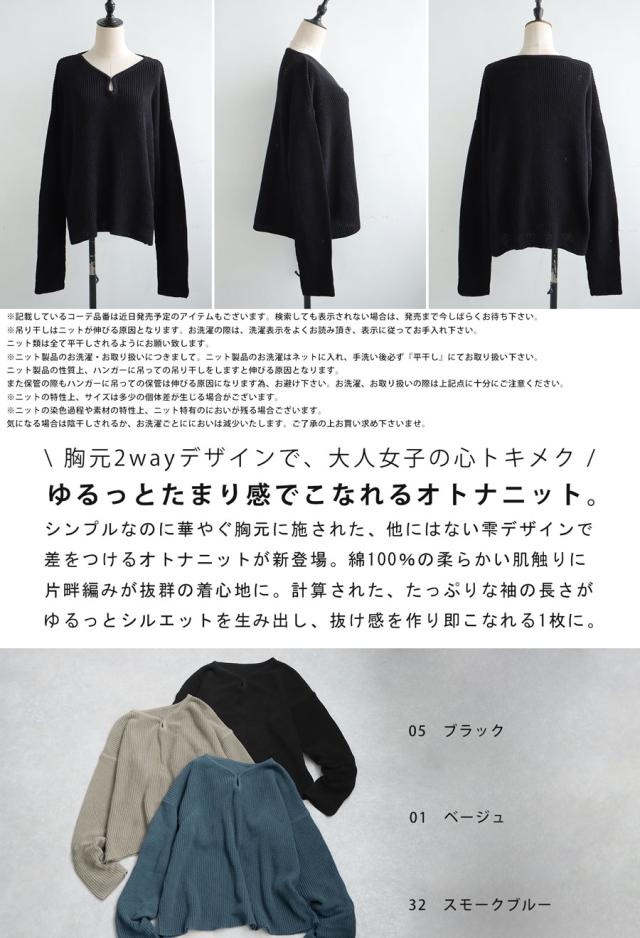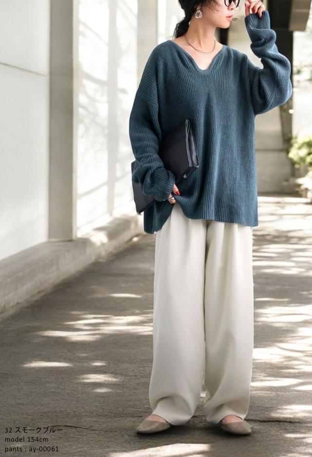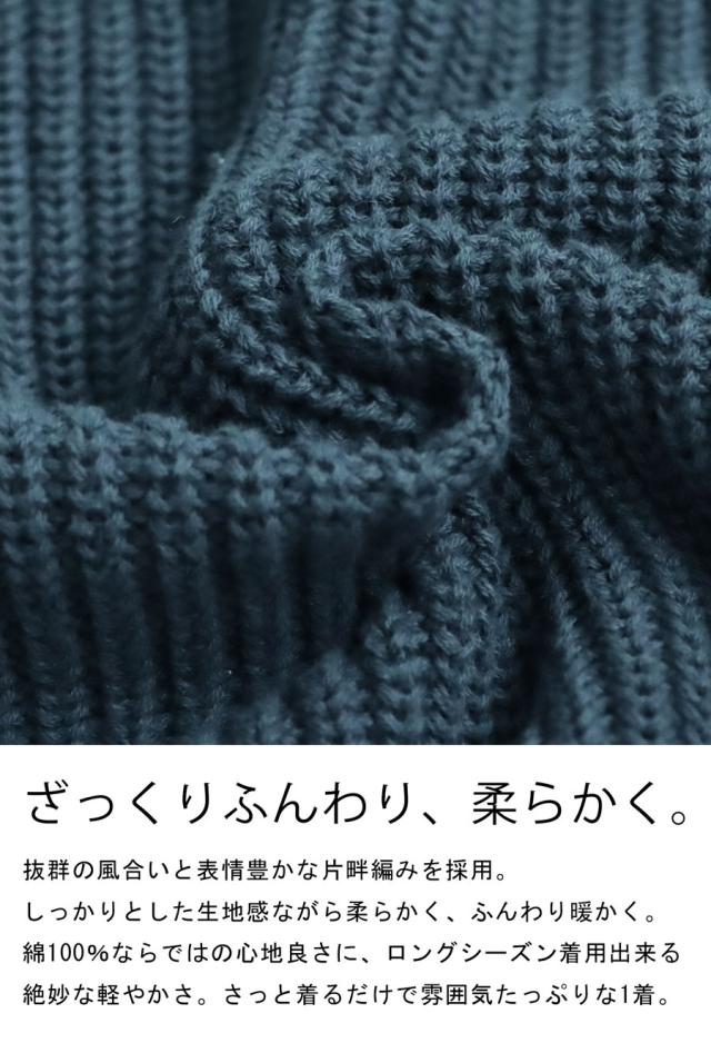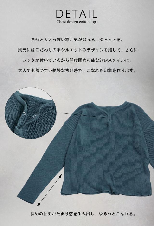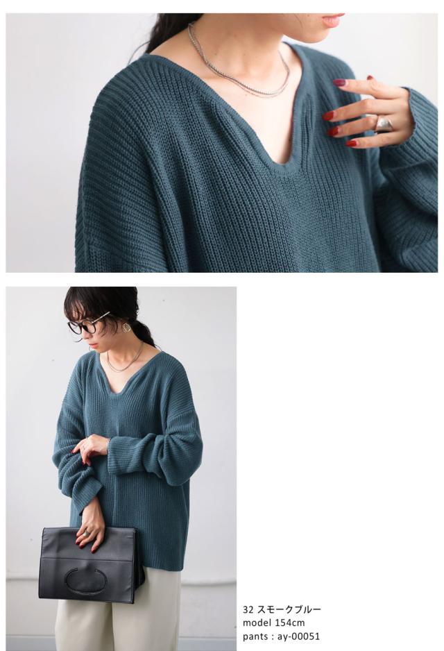 pn-00527 綿100 長袖 無地 片畦編み デコルテ 涙開き フック Vネック 袖丈 長め 重ね着 ゆったり シンプル きれいめ ナチュラル 体型カバー 細見え 着痩せ 大きめ セーター