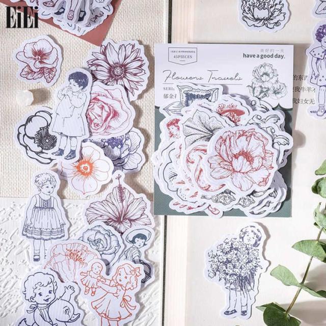 海外シール フレークシール コラージュ 素材 45枚 手描き 線画 色塗り シール 外国 人物シール 花柄 薔薇 女の子 ガール フラワー シンプル スクラップブッキング 海外ステッカー ジャーナル デコレーション 手帳 デコ シール 日記 アルバム アレンジ 手芸 DIY
