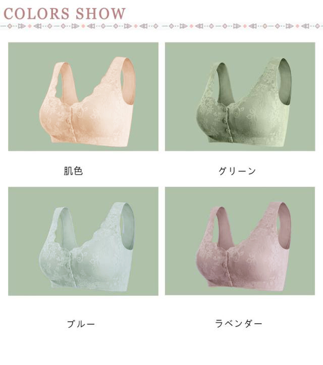 | ・ブラの着脱がしんどいと感じたら、前開き仕様の着脱らくちんのソフトブラ(ノンワイヤー) ・大きめのスナップボタンだから留め外しが簡単。 ・カップ部分にレースをあしらい自然なオシャレ感を演出。術後のブラジャーには見えません。 ・ほどよくフィットしてバストをやさしく整えます。 ・お手持ちのパッドを入れられるパッド受け付きなので、シーンに合わせてパッドをいれてもOK。 ※パットは付属しておりません。 | |