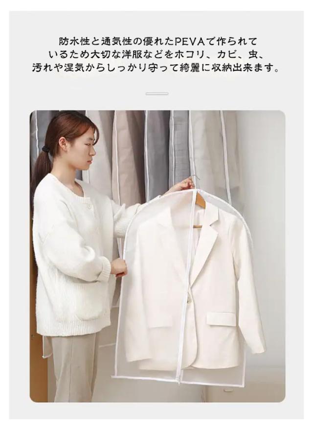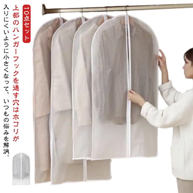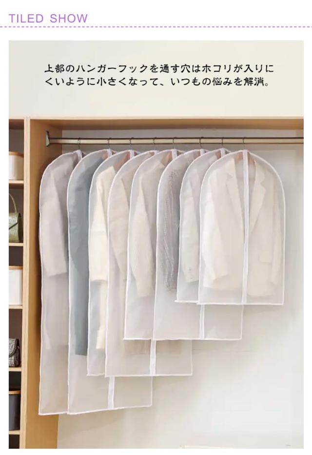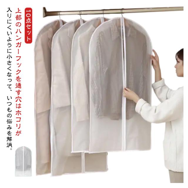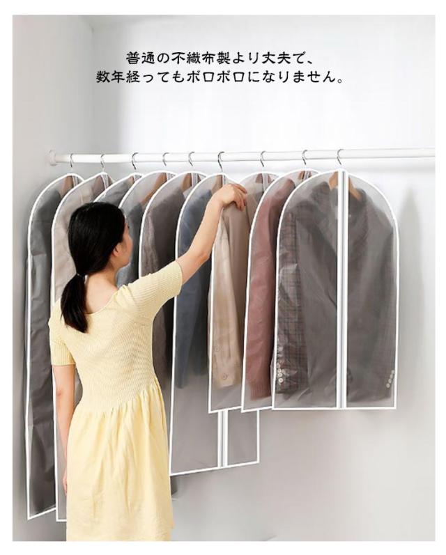 | 【10点セット】上部のハンガーフックを通す穴はホコリが入りにくいように小さくなって、いつもの悩みを解消。 上部のハンガーフックを通す穴はホコリが入りにくいように小さくなって、いつもの悩みを解消。 中身が一目瞭然で洋服を見つける時間短縮。 防水性と通気性の優れたPEVAで作られているため大切な洋服などをホコリ、カビ、虫、汚れや湿気からしっかり守って綺麗に収納出来ます。 洗濯できる生地なので、カバーが汚れた場合、やさしく手洗いしたり、濡れた布で拭きすぐに綺麗になりますので、長期間繰り返して使用可能です。 普通の不織布製より丈夫で、数年経ってもボロボロになりません。 | |