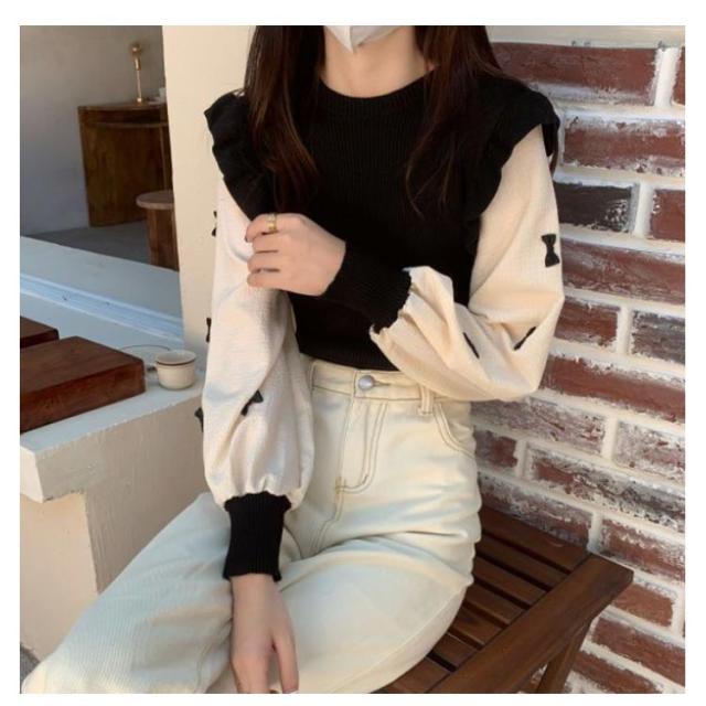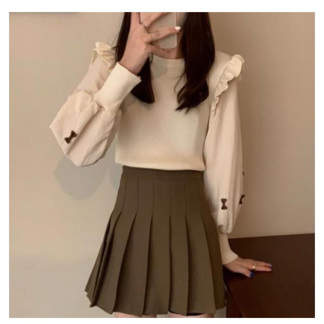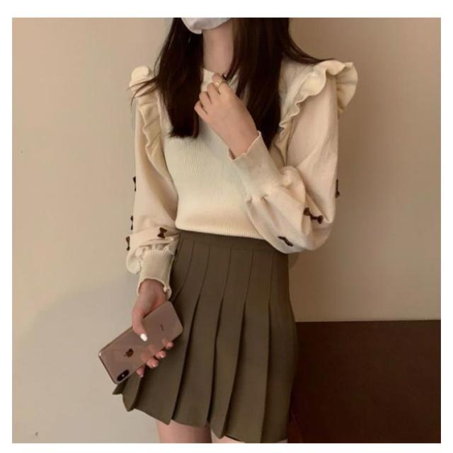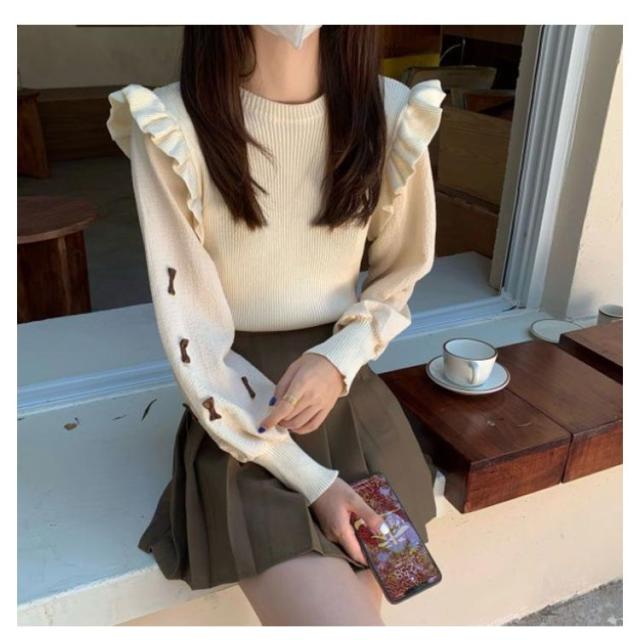 長袖 ぽわん袖 秋冬 パフスリーブ 通学 トップス ニットトップス 肩フリル プルオーバー シャツ ブラウス ニットセーター 大人かわいい 可愛い きれいめ おしゃれ 通勤 レディース