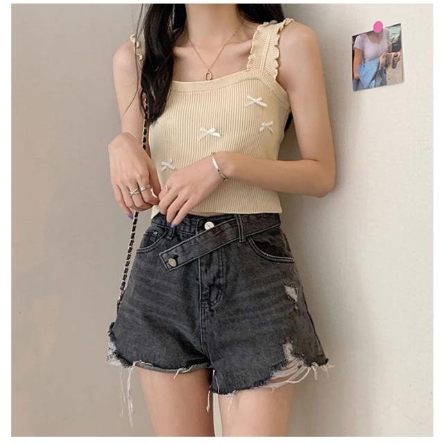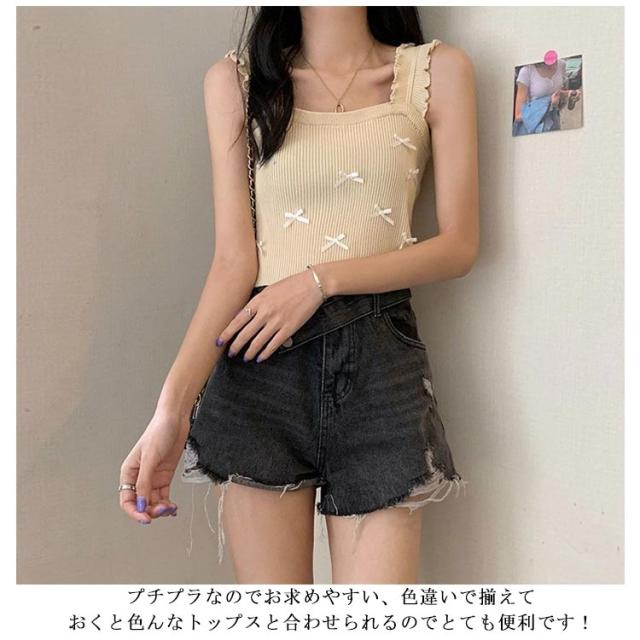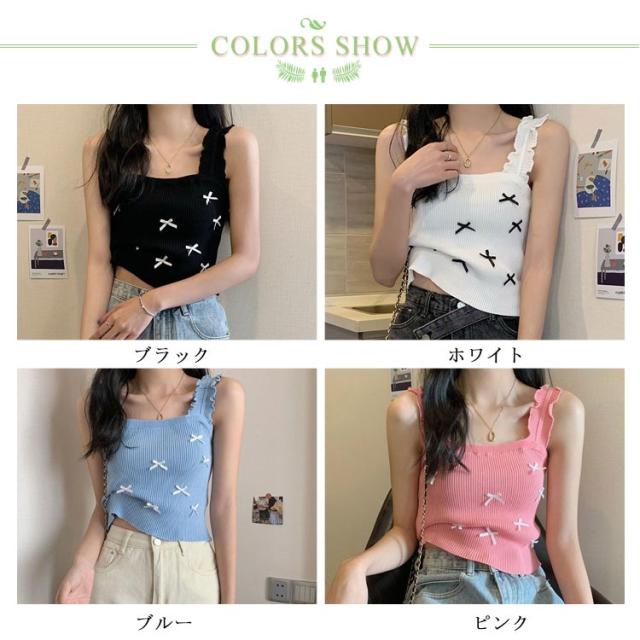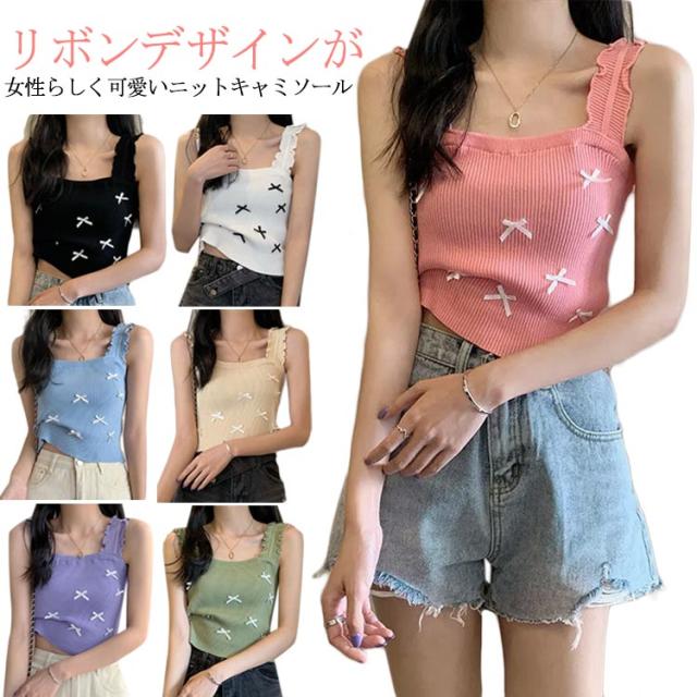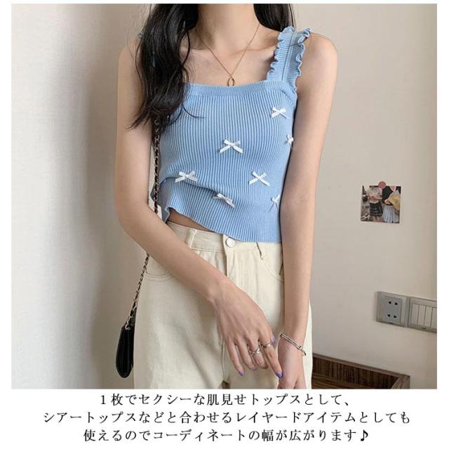 リブニット 薄 夏 スクエアネック リボンサマーニット 重ね着 ノースリーブ タンクトップ ニット インナー ブルー ノースリーブ 涼しい 春夏 サマーニット レイヤード リブ トップス ブラック ホワイト リボンサマーニット ピンク ベージュ パープル