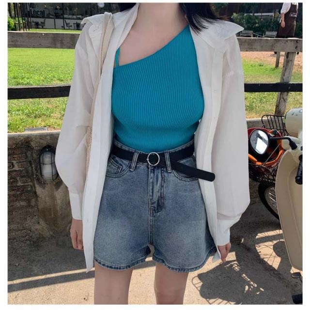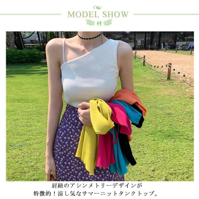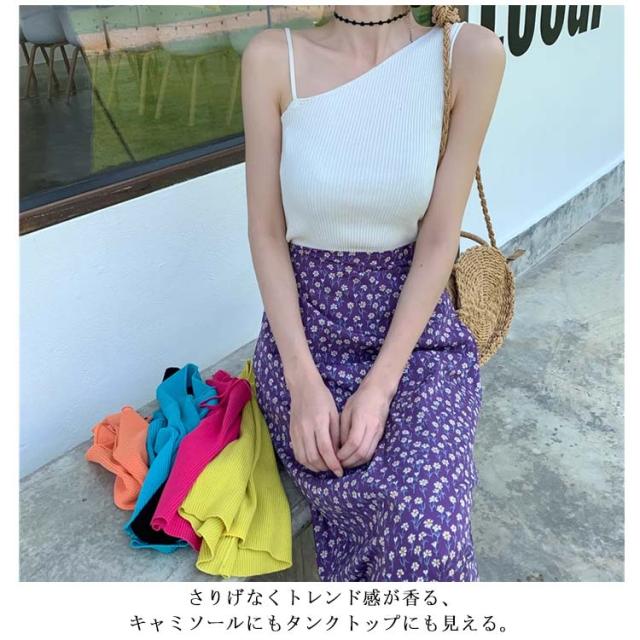 | 肩紐のアシンメトリーデザインが特徴的!涼し気なサマーニットタンクトップ。 さりげなくトレンド感が香る、キャミソールにもタンクトップにも見える。 伸縮性の良いニット生地を使用してるので、窮屈さを感じさせないストレスフリーな着心地です♪ 主役のトップス使いからインナーまで、着回し自在なトップスです。 一枚使いは勿論、シャツやシアートップスを重ねてトレンドのレイヤードスタイルを楽しむのもおすすめです。 | |