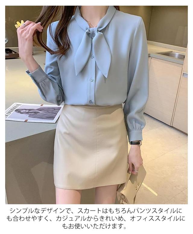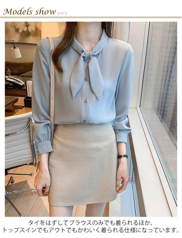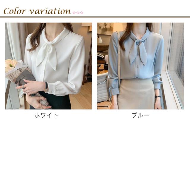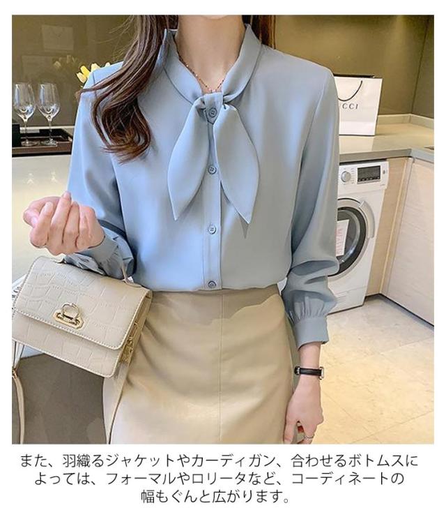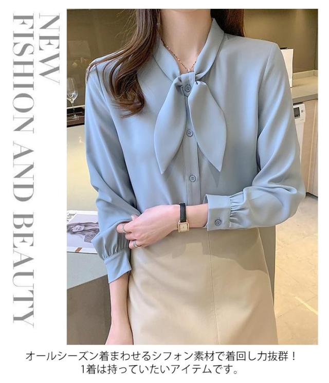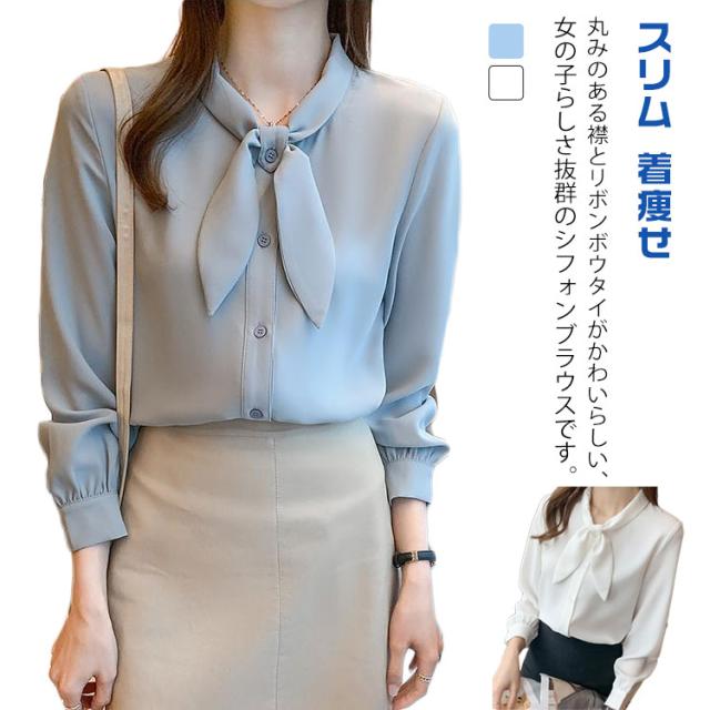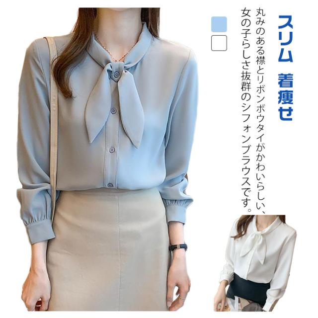 長袖 ワイシャツ 可愛い リボンブラウス シャツ ブラウス 大人 ボウタイ 着痩せ ブラウス スリム レディース 白 ブルー オフィス 通勤 無地 春夏 大きいサイズ