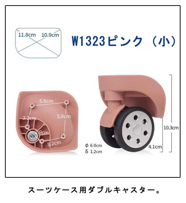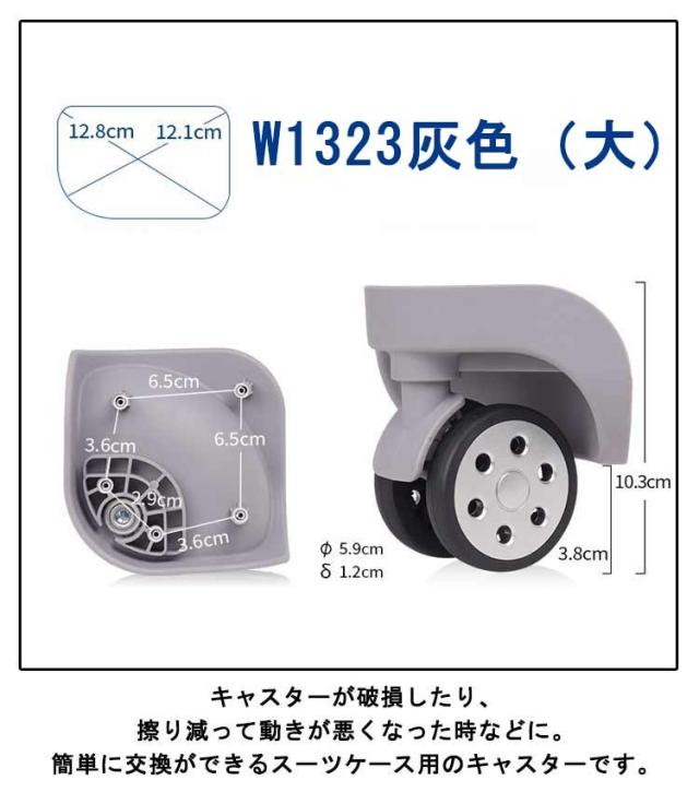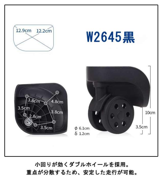 | スーツケース用ダブルキャスター。 キャスターが破損したり、擦り減って動きが悪くなった時などに。簡単に交換ができるスーツケース用のキャスターです。 小回りが効くダブルホイールを採用。重点が分散するため、安定した走行が可能。 4個セットですので一部を交換したり、壊れた時の予備として保管しておくと安心です。 | |