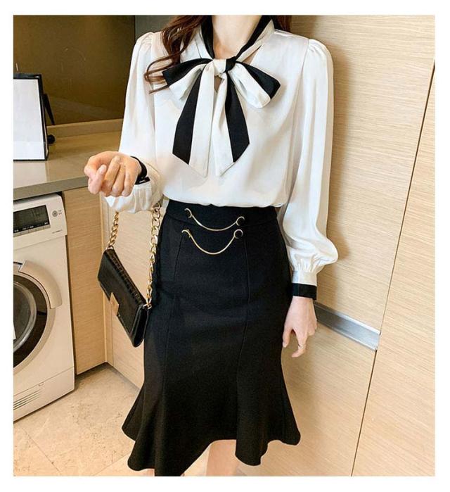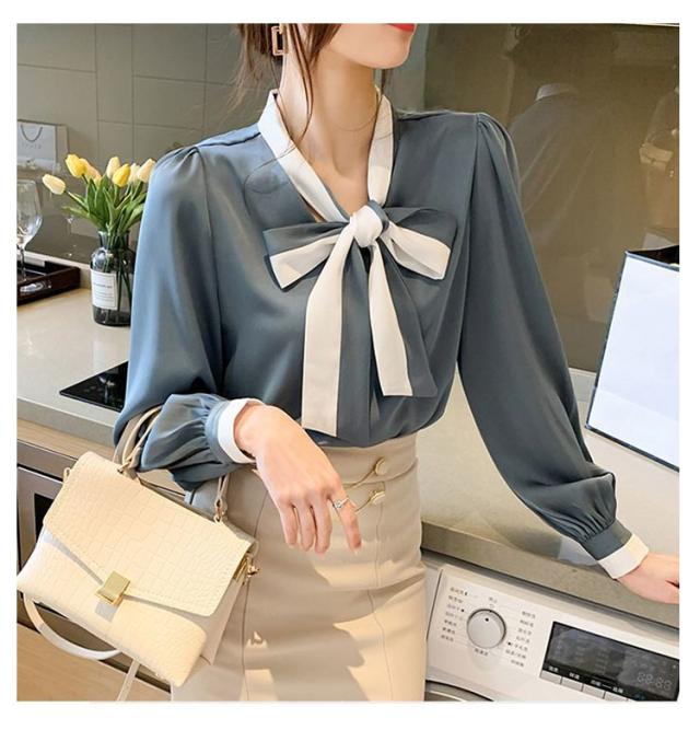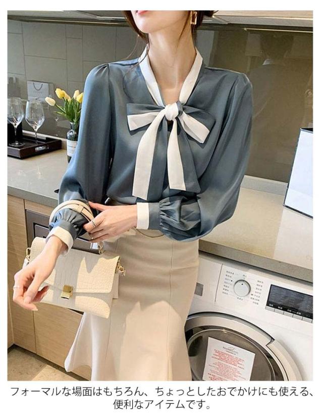 ボウタイブラウス ボウタイリボン 配色ボウタイブラウス 配色ボウタイブラウス シャツ 長袖 ブラウス リボン ボウタイ トップス 通勤 きれいめ デート お出掛け 配色 オフィス OL 日常 エレガント 卒業式 入学式 入園式