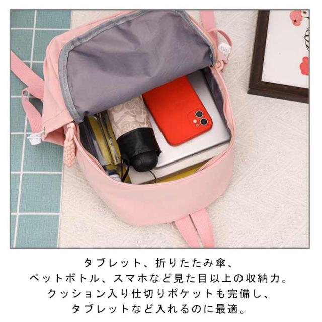 | 素敵な色合いとコンパクトなサイズが可愛い♪ タブレット、折りたたみ傘、ペットボトル、スマホなど見た目以上の収納力。 パスポートやスマホ、財布など貴重品を入れるのに安心の背面ジップポケット、盗難防止に役たち、海外旅行など時大活躍。 クッション入り仕切りポケットも完備し、タブレットなど入れるのに最適。 丈夫なナイロン素材を使用した、スッキリデザインの小さめリュック、様々なコーデやスタイリングに合わせやすく、普段使いに最適です。 | |