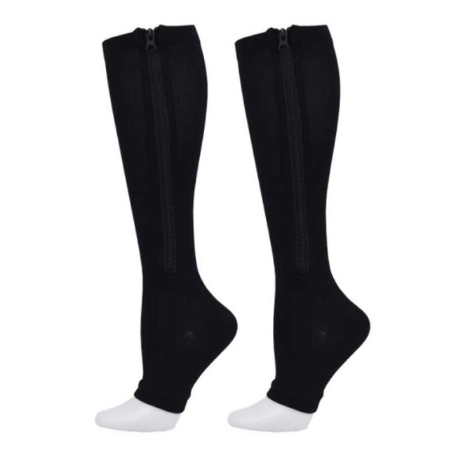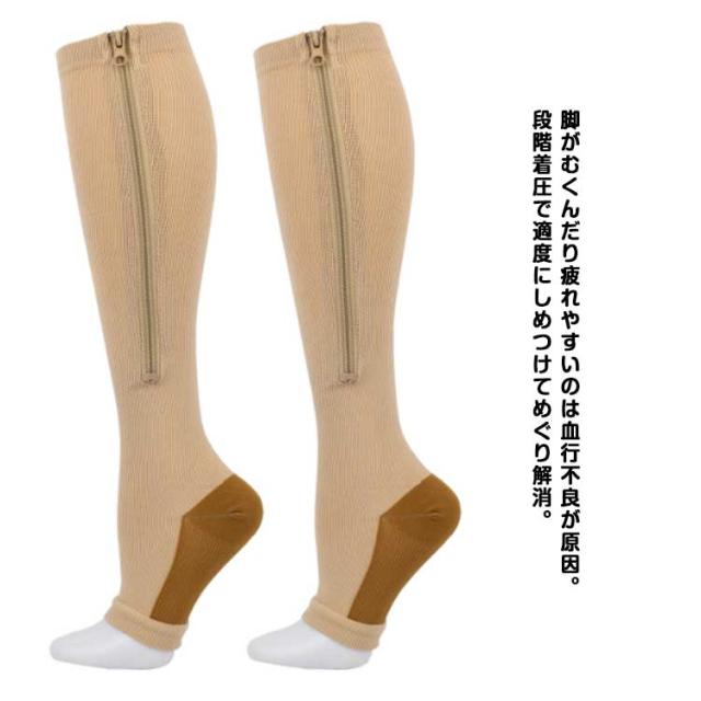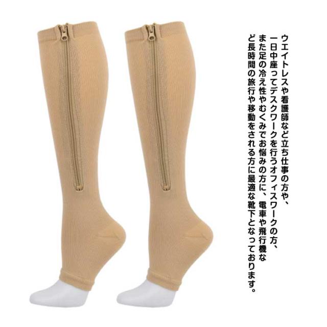 | ファスナー付き着圧タイプハイソックス。運動時の筋肉、骨格をサポートしてくれるコンプレッションソックスです。 ジッパー付きで着脱も簡単にできます。 ウエイトレスや看護師など立ち仕事の方や、一日中座ってデスクワークを行うオフィスワークの方、また足のやむくみでお悩みの方に、電車や飛行機など長時間の旅行や移動をされる方に最適な靴下となっております。 トップクラスの強力着圧であなたの美脚体験をサポート! 家事や立ち仕事で疲れた脚を癒してくれます。 つま先オープンで脚がムレず窮屈感がありません。 脚がむくんだり疲れやすいのは血行不良が原因。段階着圧で適度にしめつけてめぐり解消。 | |