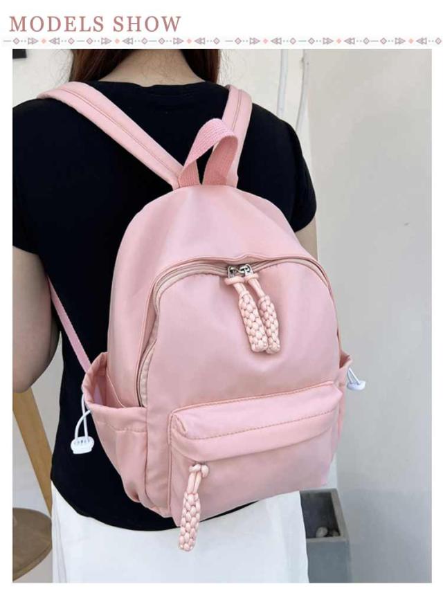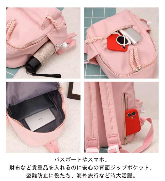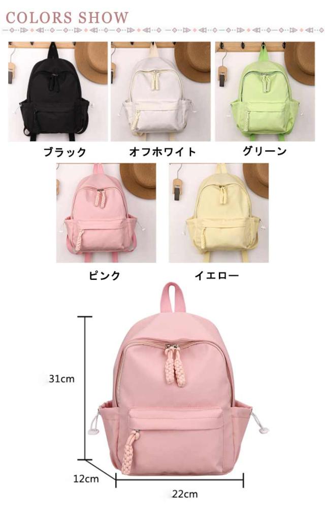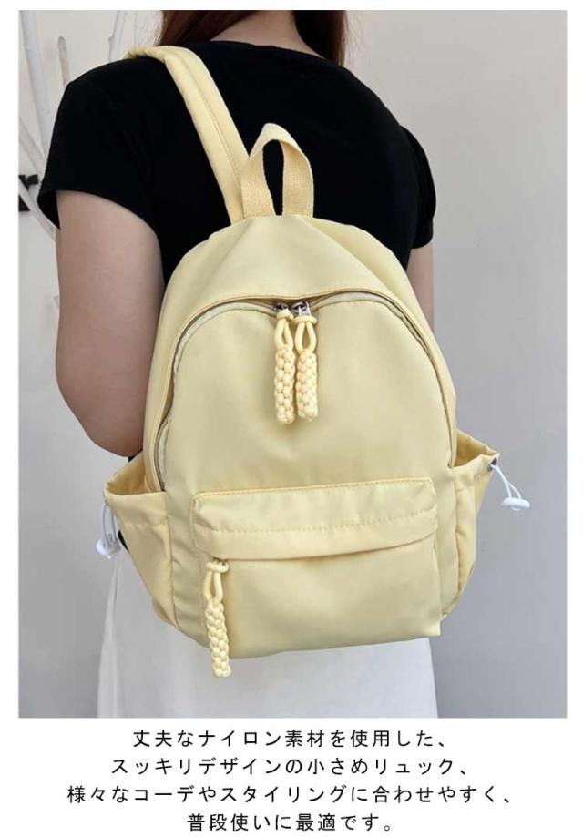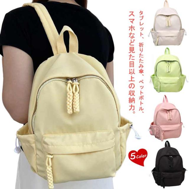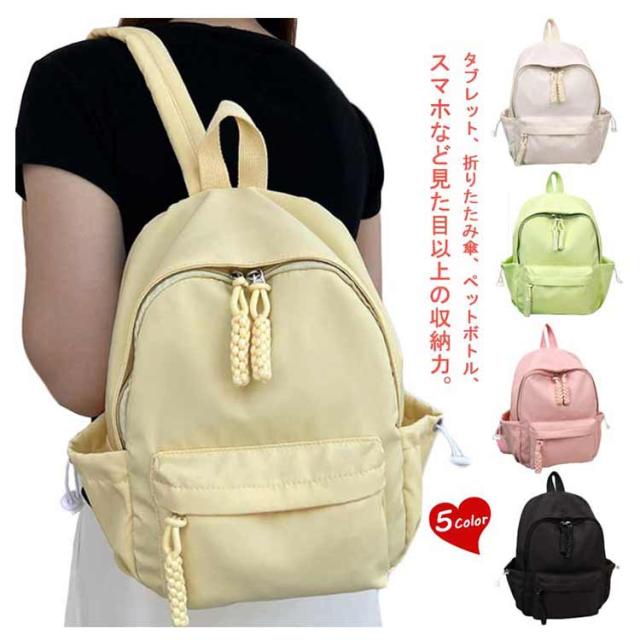 | 素敵な色合いとコンパクトなサイズが可愛い♪ タブレット、折りたたみ傘、ペットボトル、スマホなど見た目以上の収納力。 パスポートやスマホ、財布など貴重品を入れるのに安心の背面ジップポケット、盗難防止に役たち、海外旅行など時大活躍。 クッション入り仕切りポケットも完備し、タブレットなど入れるのに最適。 丈夫なナイロン素材を使用した、スッキリデザインの小さめリュック、様々なコーデやスタイリングに合わせやすく、普段使いに最適です。 | |