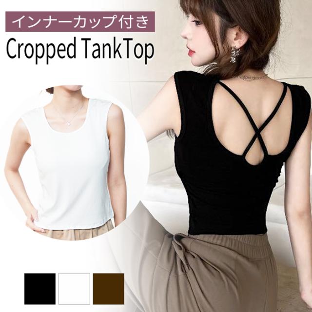 タンクトップ カップ付き クロップド 背中見せ バッククロス ブラトップ 締め付けない シンプル 無地 オシャレ インナー トップス レディース 楽ちん キレイ 美胸 快適 ストレッチ ナチュラル盛り ブラタンク スクエアネック ノースリーブ 肌見せ 黒 白 茶 M L LL rr-020