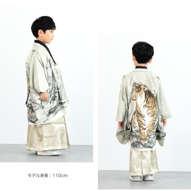 羽織には虎など雄々しい絵柄が配され、着物はシンプルな無地のデザインです。