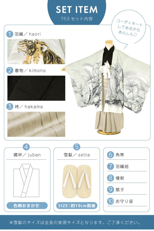 セット内容は【羽織・着物・袴・襦袢・雪駄・角帯・羽織紐・懐剣・扇子・お守り袋】です。