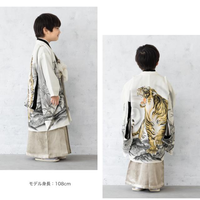 羽織には虎など雄々しい絵柄が配され、着物はシンプルな無地のデザインです。