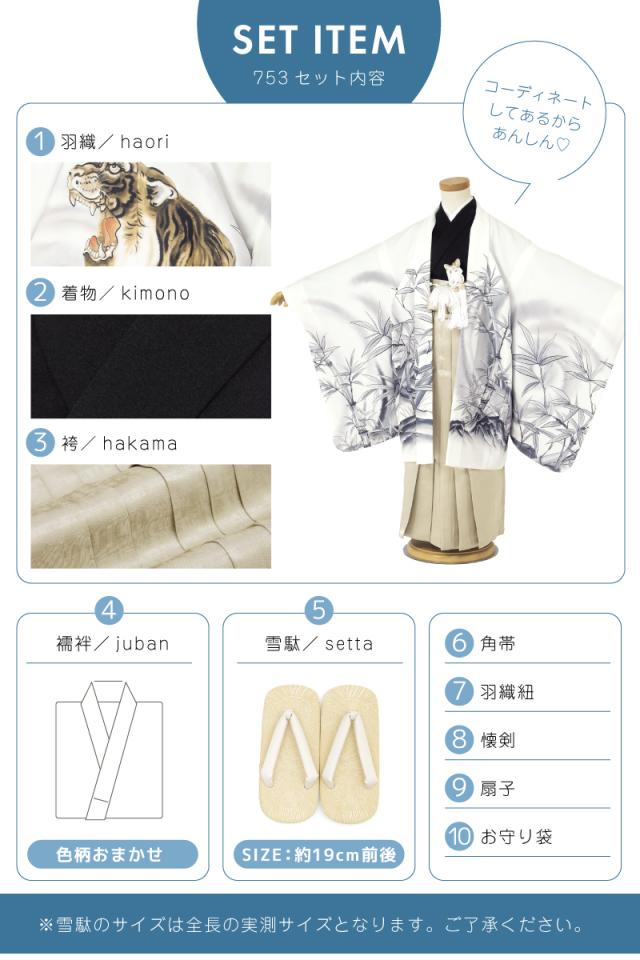 七五三 着物 5歳 販売 五歳 袴セット 羽織 半襦袢 袴帯 羽織紐 扇子 懐剣 お守り袋 雪駄 セット 虎 白 ゴールド 男の子 和服 男児 送料無料