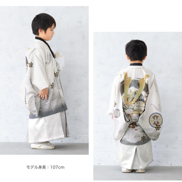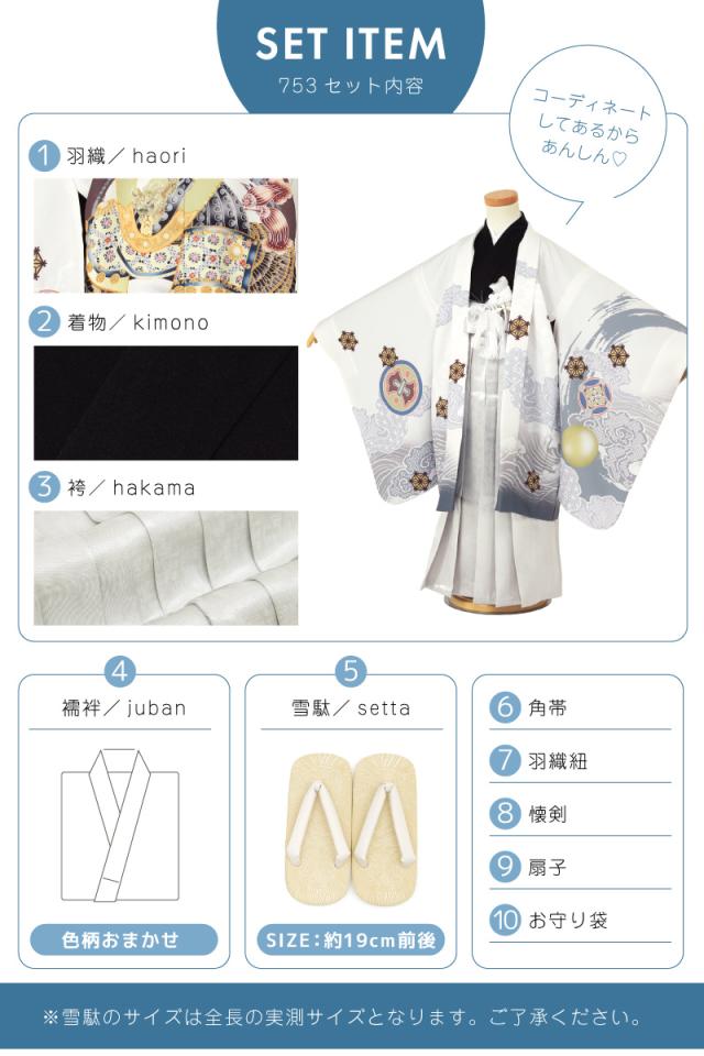 七五三 着物 5歳 販売 五歳 袴セット 羽織 半襦袢 袴帯 羽織紐 扇子 懐剣 お守り袋 雪駄 セット 兜 波 白 シルバー 男の子 和服 男児 送料無料
