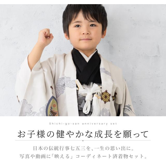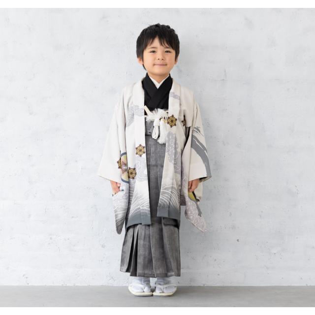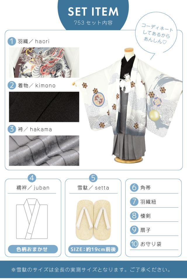 七五三 着物 5歳 販売 五歳 袴セット 羽織 半襦袢 袴帯 羽織紐 扇子 懐剣 お守り袋 雪駄 セット 龍 波 白 グレー 男の子 和服 男児 送料無料