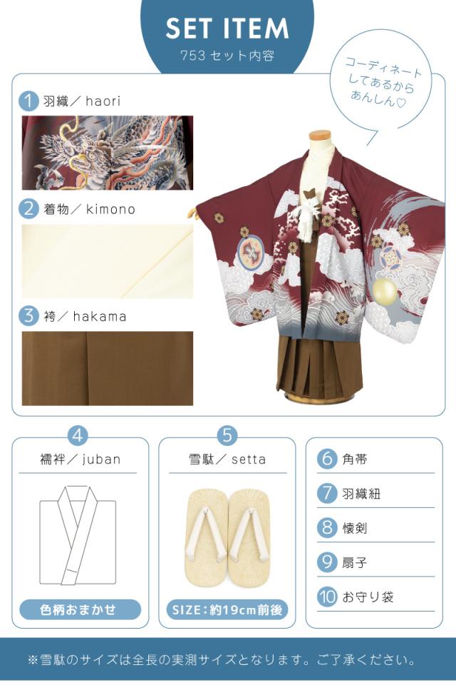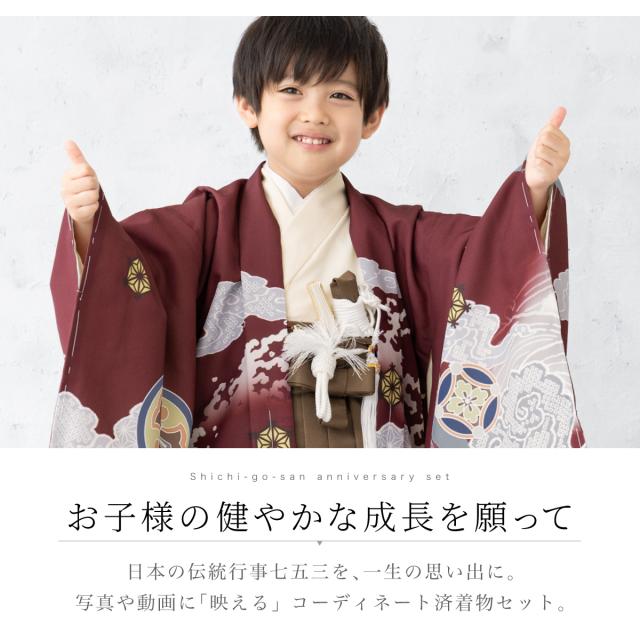 七五三 着物 5歳 販売 五歳 袴セット 羽織 半襦袢 袴帯 羽織紐 扇子 懐剣 お守り袋 雪駄 セット 龍 波 茶 えんじ 男の子 和服 男児 送料無料