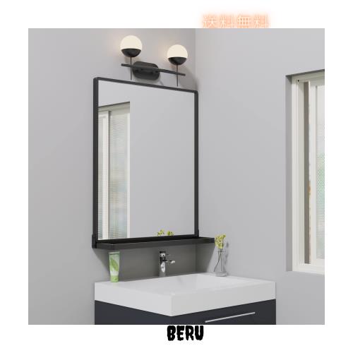 【インダストリアルスタイル】壁掛け鏡はインダストリアルデザインで、マットブラックの外観です。棚の収納ディテールが加わり、便利さももたらされています。