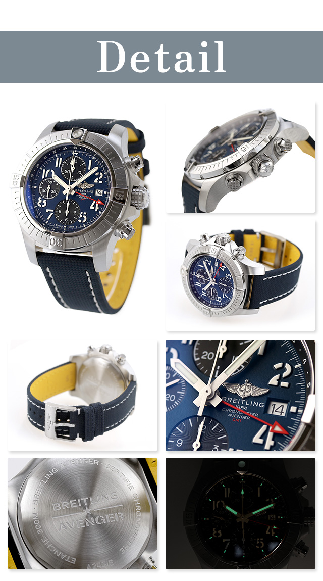 ブライトリング アベンジャー クロノグラフ GMT 45 クロノグラフ スイス製 メンズ 腕時計 A24315101C1X1 BREITLING AVENGER CHRONOGRAPH GMT 45 アナログ ブルー ネイビー イエロー ◆BREITLING(ブライトリング)は独自のムーブメントを製造する数少ない独立系時計メーカーです。1884年 レオン・ブライトリングが、サンティミエのヌーヴ広場1番に最初の工房を開設。独自のアイコニックな時計を考案し、開発と製造を始めました。彼のデザインは後に特許を取得する革新的技術につながり、これが時計製造の歴史にブライトリングの名を刻むことになりました。 アベンジャー クロノグラフ GMT 45は、時間の精度に力強さの伝わる特徴的なデザインが加わったモデルです。頑丈なベゼルと、特別なグリップパターンがあしらわれたリューズとクロノグラフプッシャーにより、グローブを装着していても簡単に操作できます。 機械式腕時計