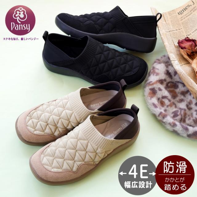 パンジー シューズ 靴 レディース Pansy フラットシューズ 歩きやすい スリッポンシューズ ストレッチニット かかとが踏める 2way 幅広 4E 外反母趾 軽量 抗菌 防滑 オブリークトゥ フラット 履きやすい