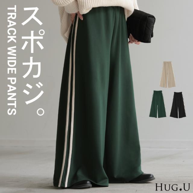 パンツ レディース ワイドパンツ トラックパンツ カラーパンツ ワイドパンツ ロング ウエストゴム 太い イージーパンツ 体型カバー 脚長 リラックス ジャージ ズボン カジュアル スポーツ 楽 きれいめ 無地 大きいサイズ 黒 グリーン 秋 夏 HUG.U 秋新作