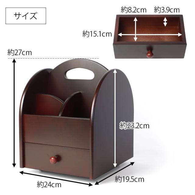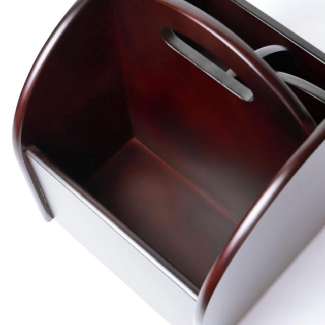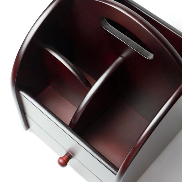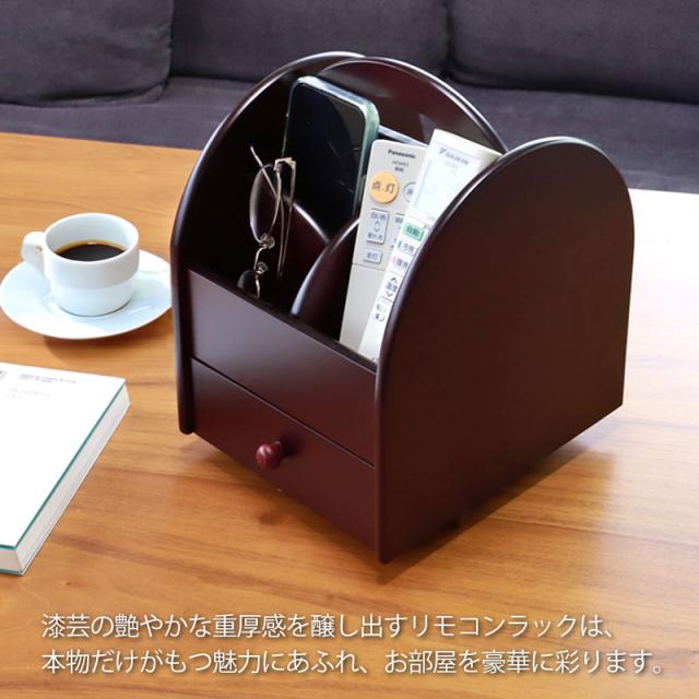 | 商品説明 | 漆芸の艶やかな重厚感を醸し出すリモコンラックは、本物だけがもつ魅力にあふれ、お部屋を豪華に彩ります。 テレビやエアコンのリモコンから、メガネやペン、ハサミなど机の上の収納ラックに。 仕切り付きの面の下段には引き出しがあり、散らかりがちな小物も収納可能です。 仕切りなしの面は書類や郵便物、ノートなどもしっかりと収納できます。 360°回転式なので、どこからでも取り出しやすく使い勝手の良いラックです。 |