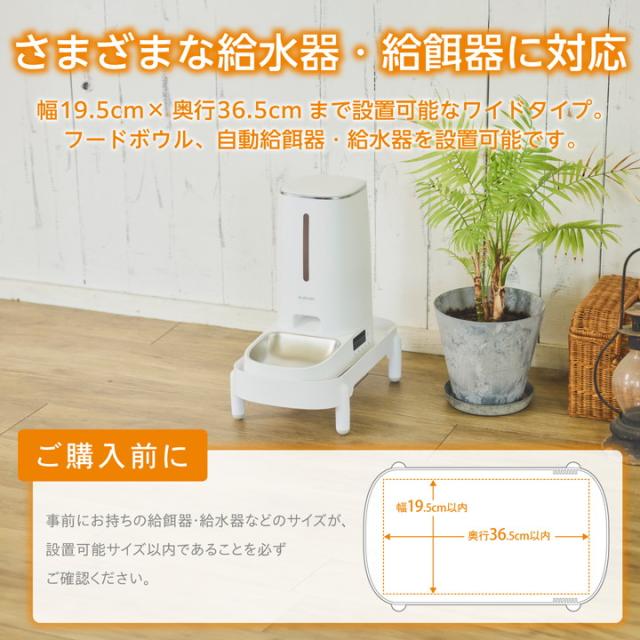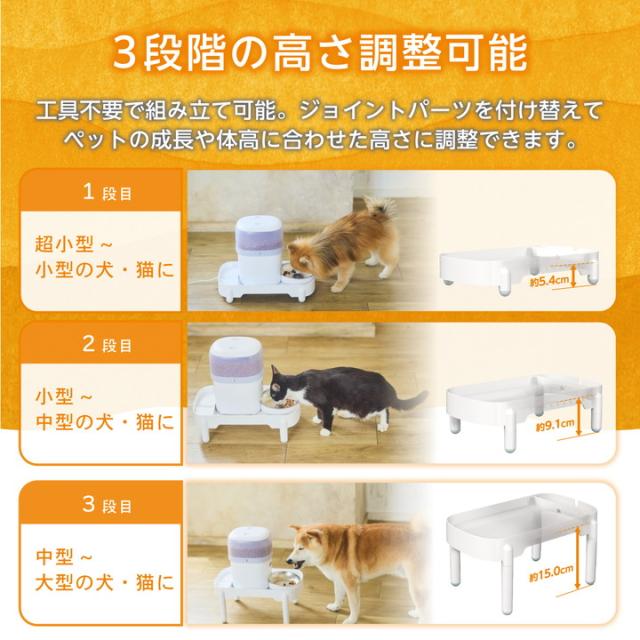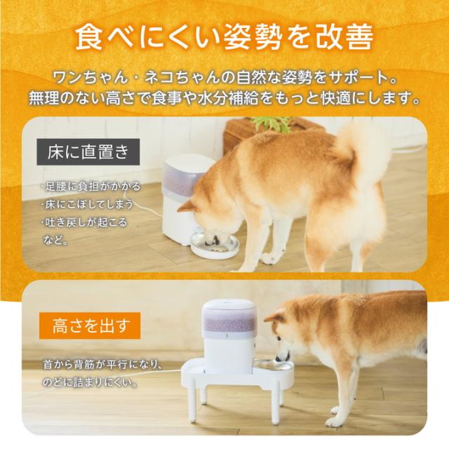 ワンちゃん・ネコちゃんの自然な姿勢をサポート。食事や水分補給をもっと快適にする、給餌・給水用スタンドです。自動給餌器・給水器やフードボウルの高さを調整し、首や足腰に負担をかけずにお使いいただけます。