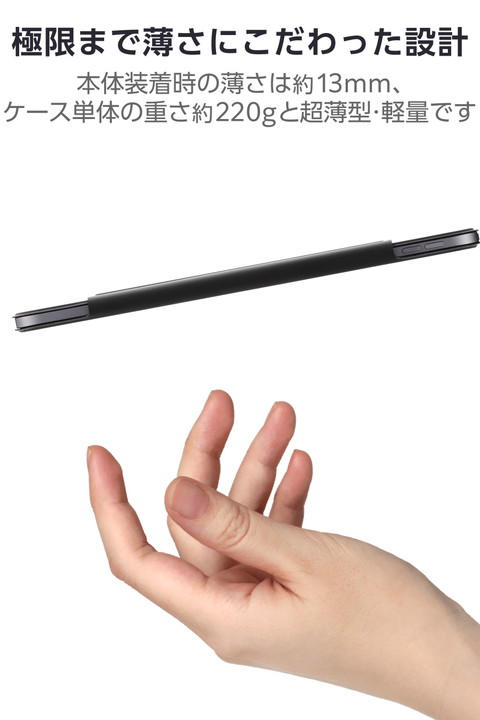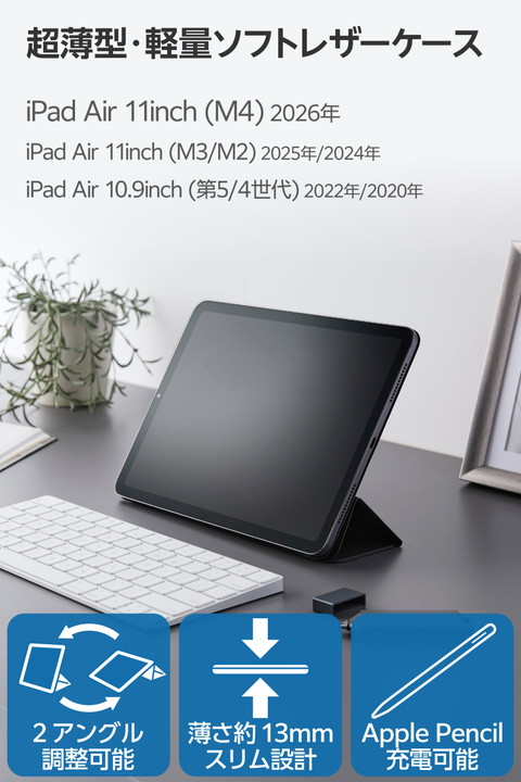 極限まで薄さにこだわった超薄型・軽量設計。動画視聴やタイピング等のシーンに合わせて2アングルにできる11インチiPad Air(M2)、iPad Air (第5世代 2022年モデル)、iPad Air (第4世代 2020年モデル)用フラップケースです。iPad本体に内蔵されたマグネットを利用して、iPadの背面にしっかり固定します。オートスリープ/オートウェイクアップ機能付きです。![]() ■極限まで薄さにこだわった軽量スリムな 11インチiPad Air(M2)、iPad Air (第5世代 2022年モデル)、iPad Air (第4世代 2020年モデル)用フラップケースです。 ■iPad本体装着時の薄さは約13mm、ケース単体の重さは約220gです。iPad本体のスリムなフォルムを損ねずにしっかり保護します。 ■iPad本体に内蔵されたマグネットを利用して、iPadの背面にしっかり固定します。 ■iPad本体と触れる内側には起毛素材を採用し、やわらかな肌触りで本体が傷つくのを防ぎます。 ■フラップカバーはマグネットでしっかり固定できます。また、オートスリープ/オートウェイクアップ機能が素早く機能します。 ■ケースに収納した状態で、Apple Pencil Pro、Apple Pencil (第2世代)のペアリングとワイヤレス充電が可能です。 ■フラップカバーを三つ折りにすることで、動画視聴と、ドローイング・タイピングに最適な2通りの角度で使用できます。 ■ケースが画面を覆わず、見やすく操作しやすい設計です。 ■ケースを装着したままで写真撮影が可能です。また、カメラレンズより厚みのあるケース設計で、カメラを下に向けて置いても安心です。 ■自社環境認定基準を1つ以上満たし、『THINK ECOLOGY』マークを表示した製品です。 ■環境保全に取り組み、製品の包装容器が紙・ダンボール・ポリ袋のみで構成されている製品です。 ![]() ■対応機種:11インチiPad Air(M2)、iPad Air (第5世代 2022年モデル)、iPad Air (第4世代 2020年モデル) ■対応モデル番号:A2902、A2903、A2316、A2324、A2325、A2072、A2588、A2589、A2591 ■セット内容:ケース×1 ■材質:表面:合成皮革、裏地:ポリエステル ■カラー:ブラック ■その他:製品寸法:幅約183mm×厚さ約13mm×高さ約250mm |